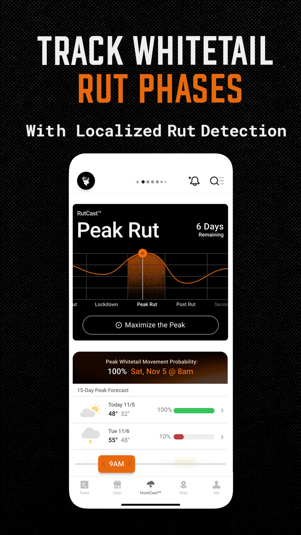 HuntCast’s proprietary algorithm tracks and analyzes key weather variables proven to influence species movement, allowing you to pinpoint, on a day by day, hour by hour basis, the absolute best times to hunt whitetail, turkey, waterfowl, big game, and more.