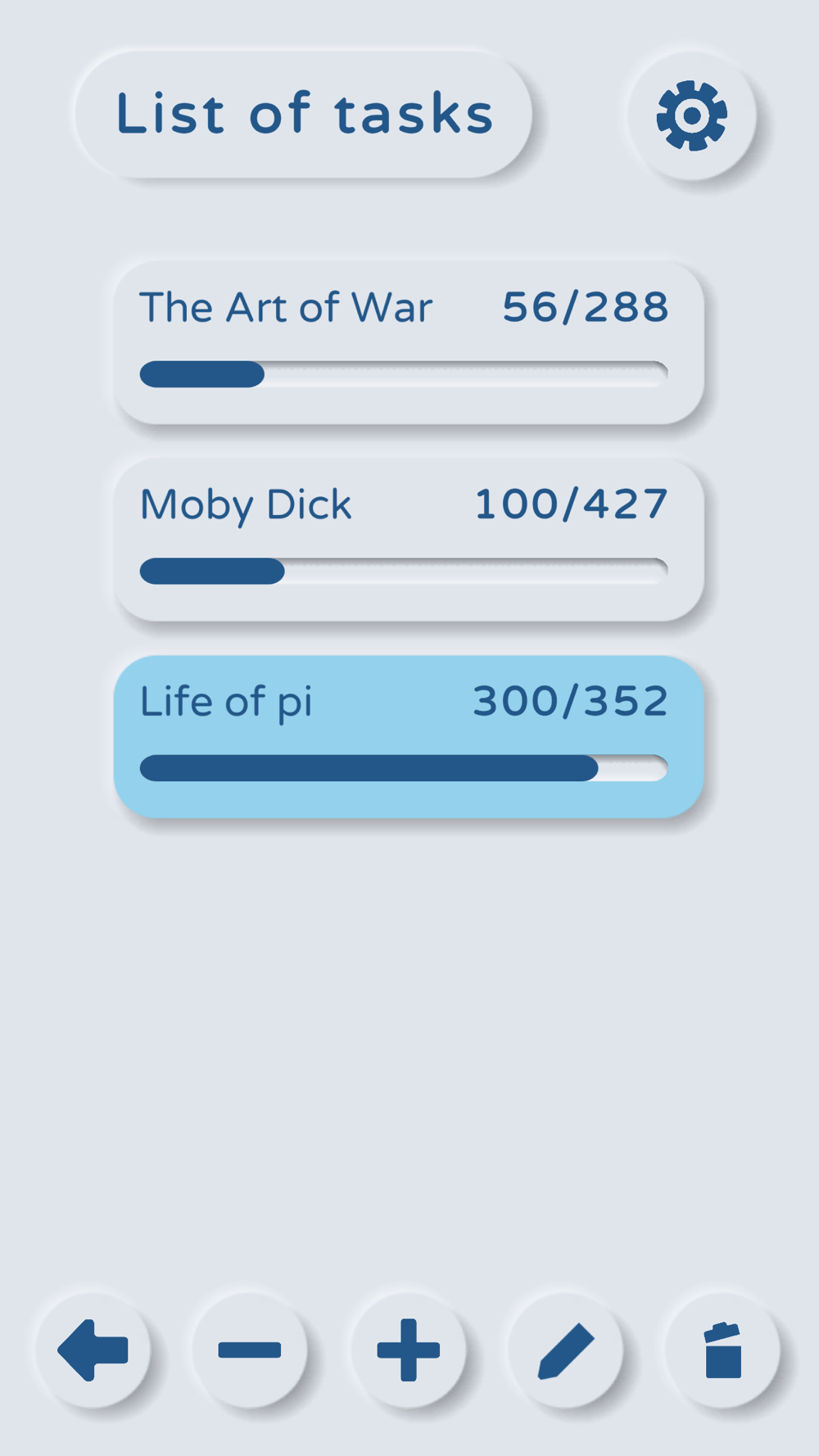 Simple Progress Tracker is an app that lets you add tasks and the desired value goal for each one. You can easily and simply increase or decrease your task progress to reach your goal! It's great for tracking courses and books.