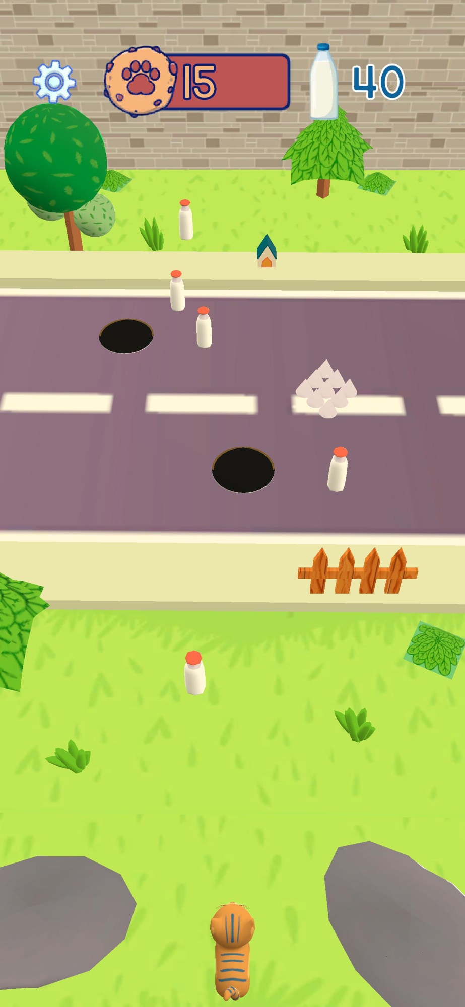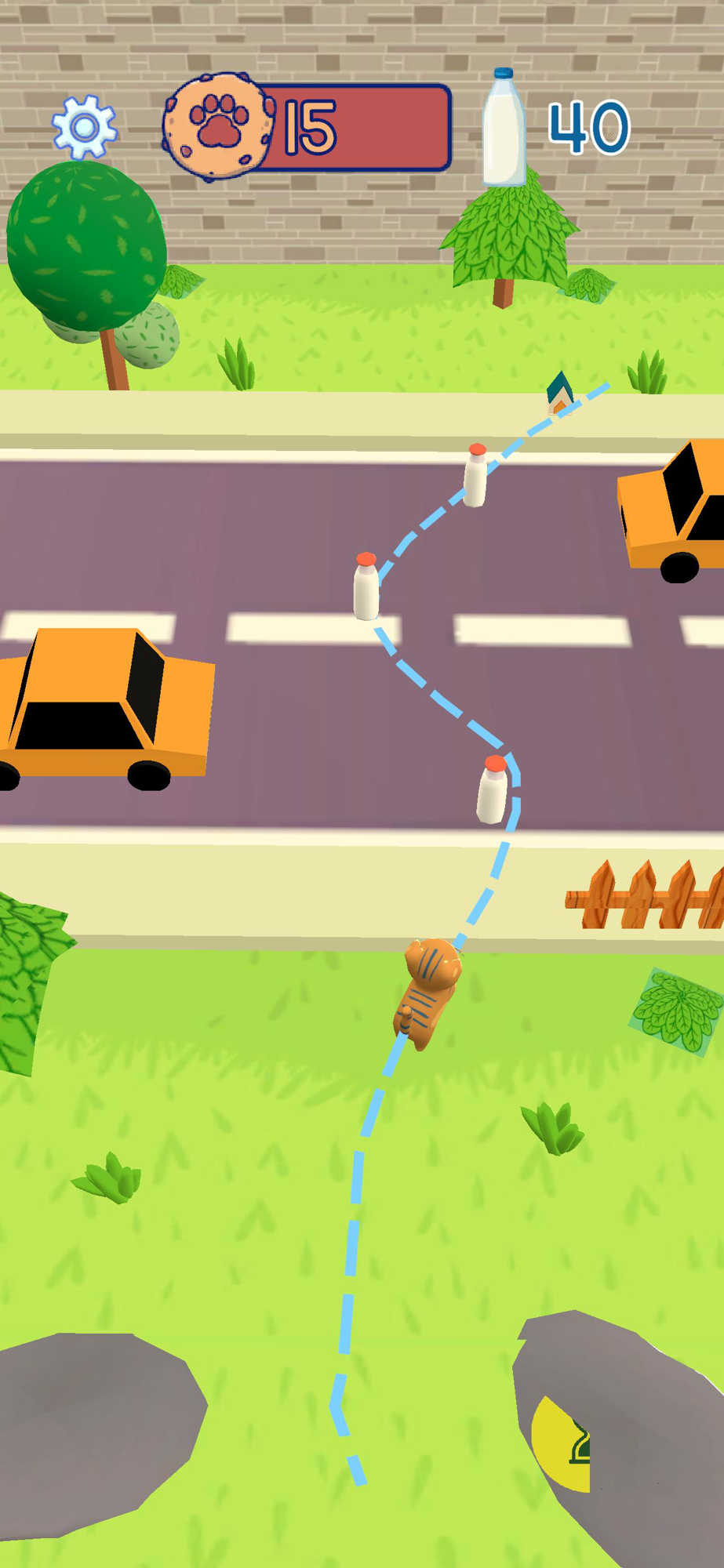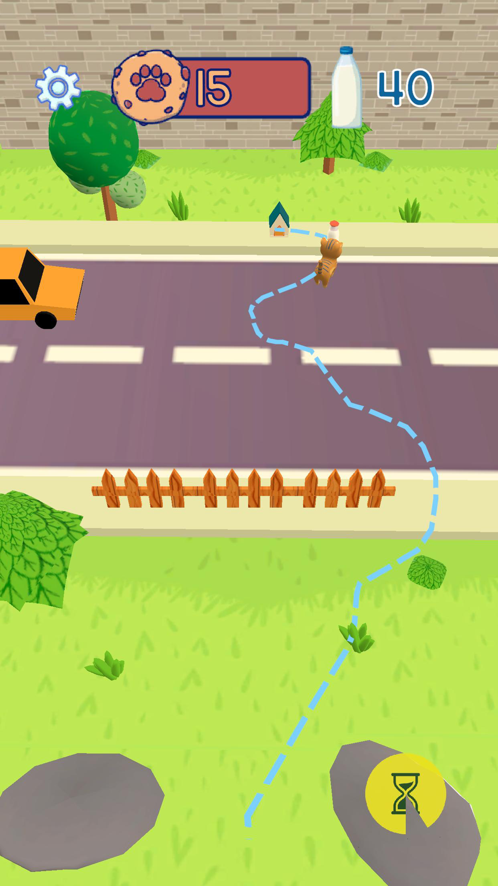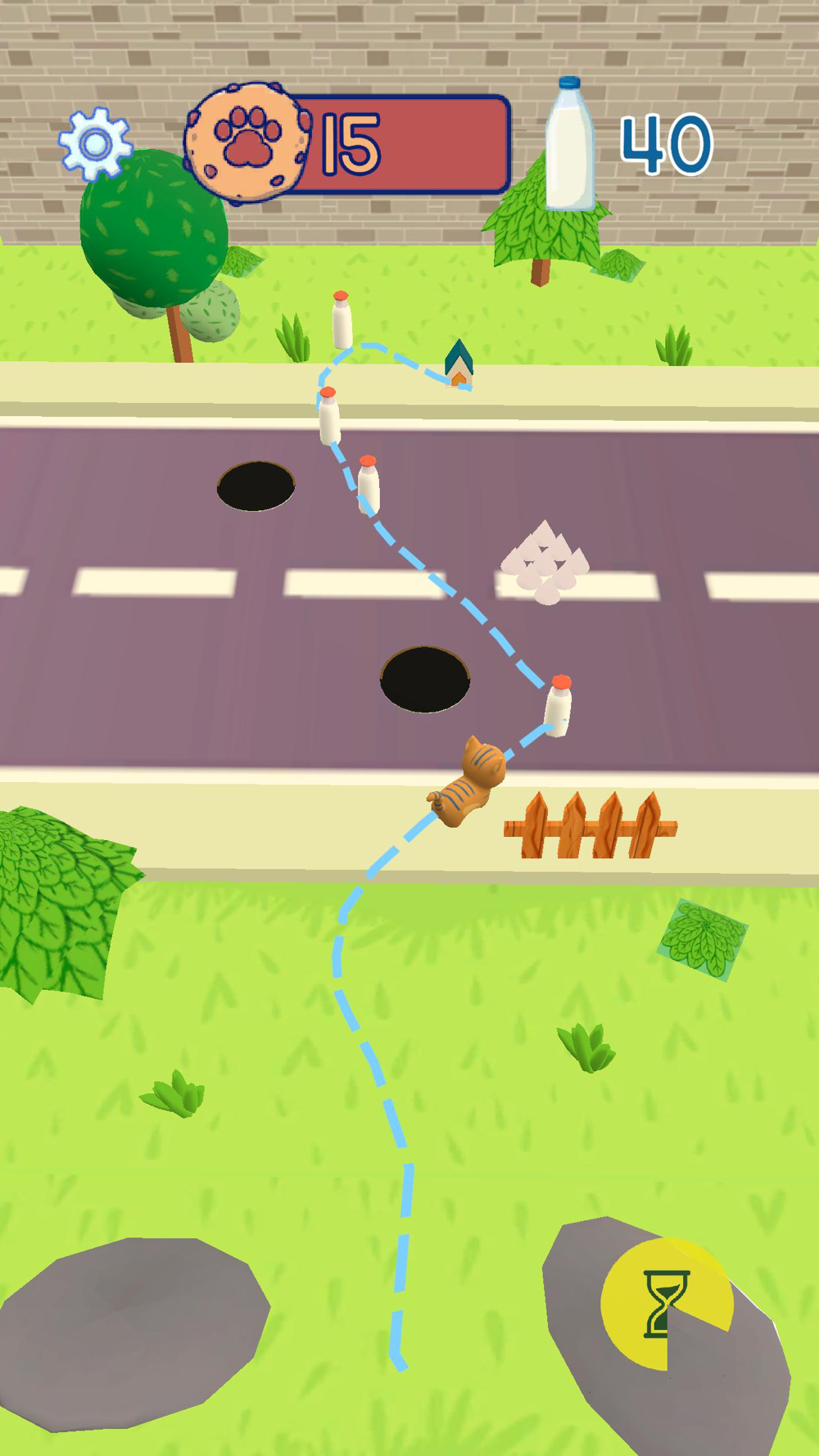 The player must draw paths so that the kitten can reach the milk carton, passing along the path that he does not take any damage, either by fixed objects or by objects that are moving, making him need to make the cat walk for more or less time to get the timings right.