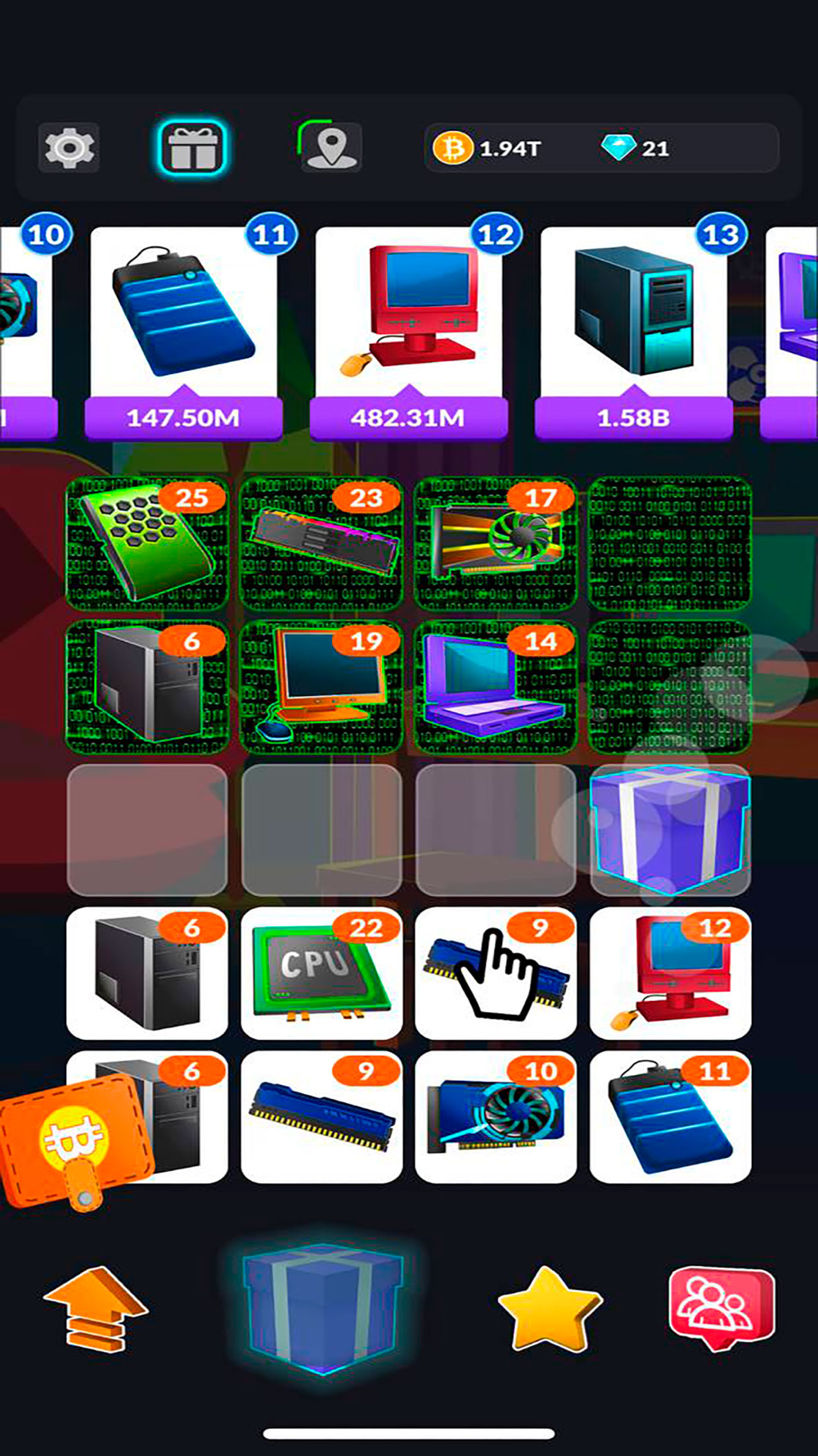 A bunch of miners. The game has more than 50 different devices for which you can collect coins.Thus, you can mine on different devices - from the monitor to the processor. Click on the field to get a new miner from which you will build a new farm.