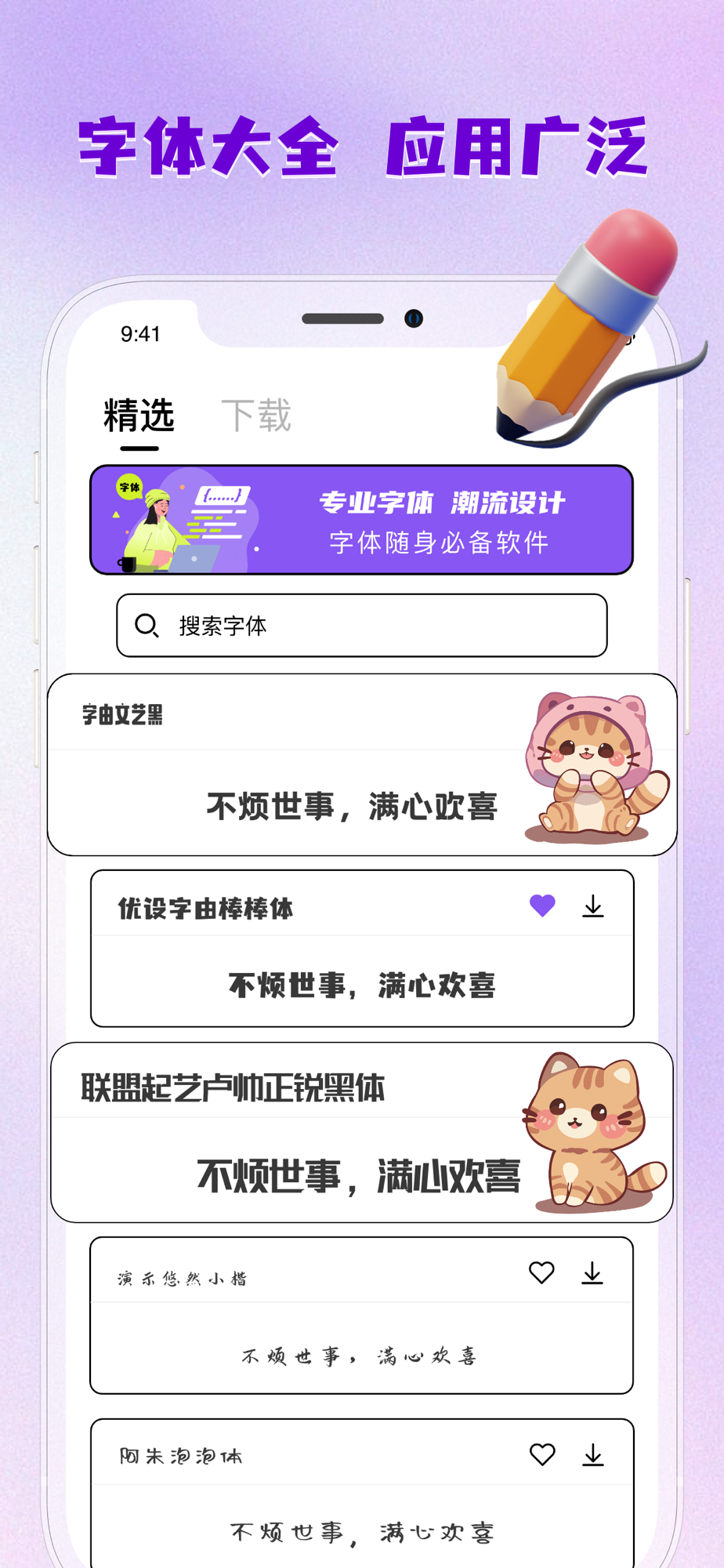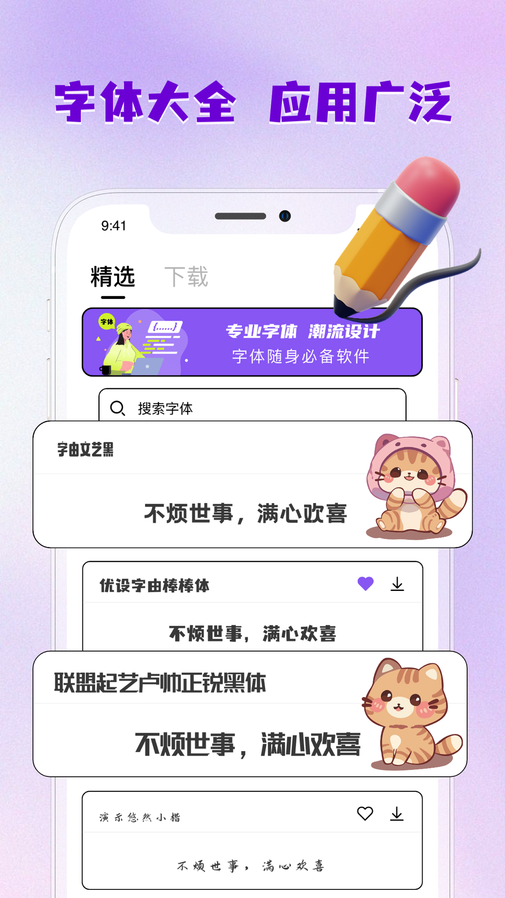 您的手机、平板必备的字体大全工具,可以安装上百款手机字体,免费下载、免费导出、免费安装,花样字体随心挑选,让你的手机不再单调!
