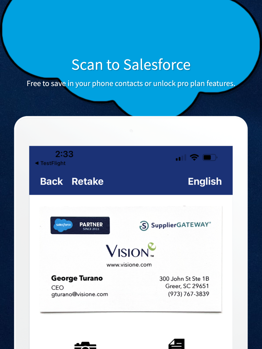 -- Unlimited OCR results to populate text fields on your phone to save in Phone contacts or send to Salesforce as a Lead or Contact