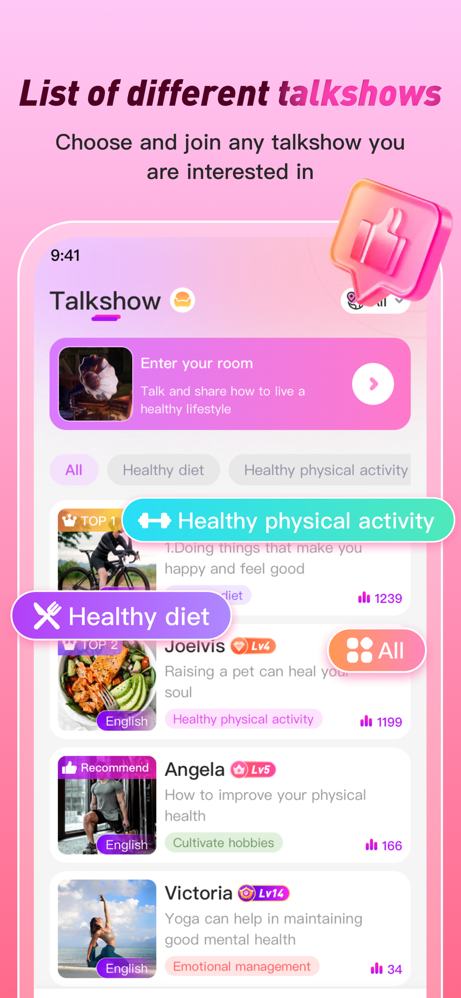 Group voice talk with other users no matter where they are, listen to other people's healthy living tips, share your own experience, or just simply chat and relax. Choose group voice rooms from thousands live rooms daily, filter rooms by languages or topics.