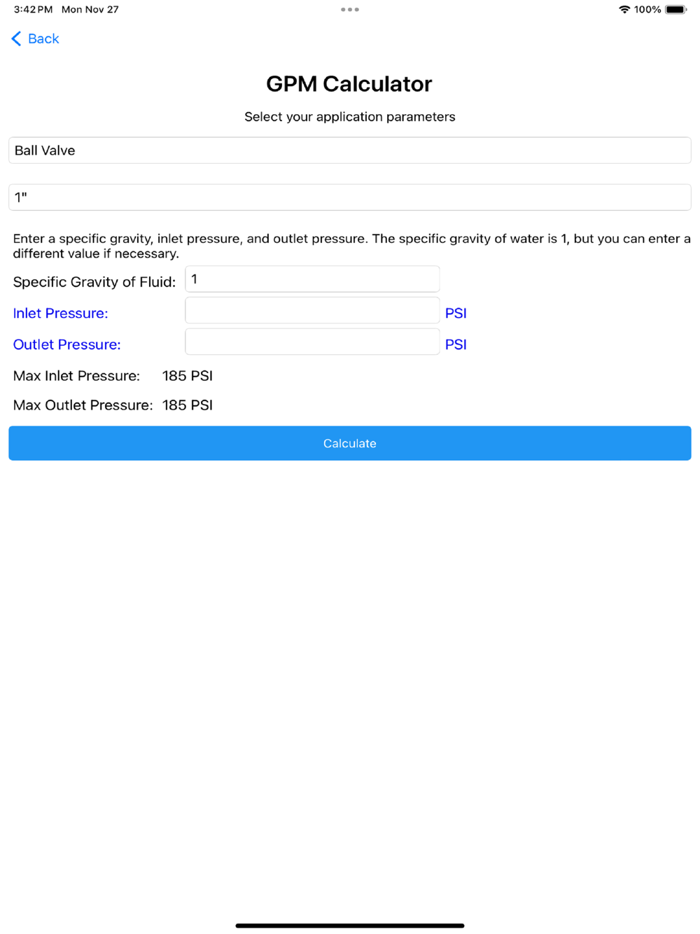 This app is designed to help you specify a valve. By utilizing your parameters, this application provides a step-by-step process to assure a proper specification.