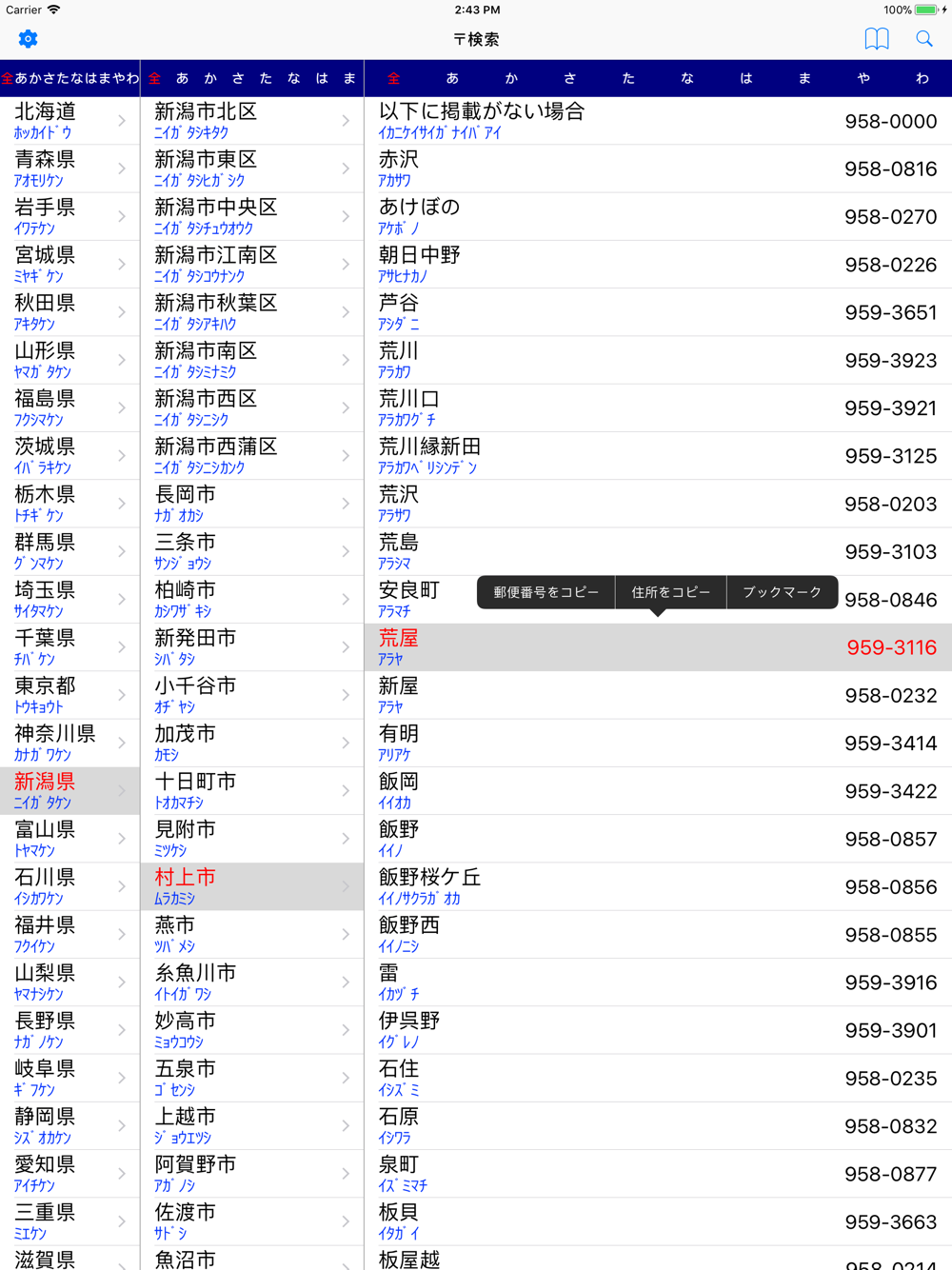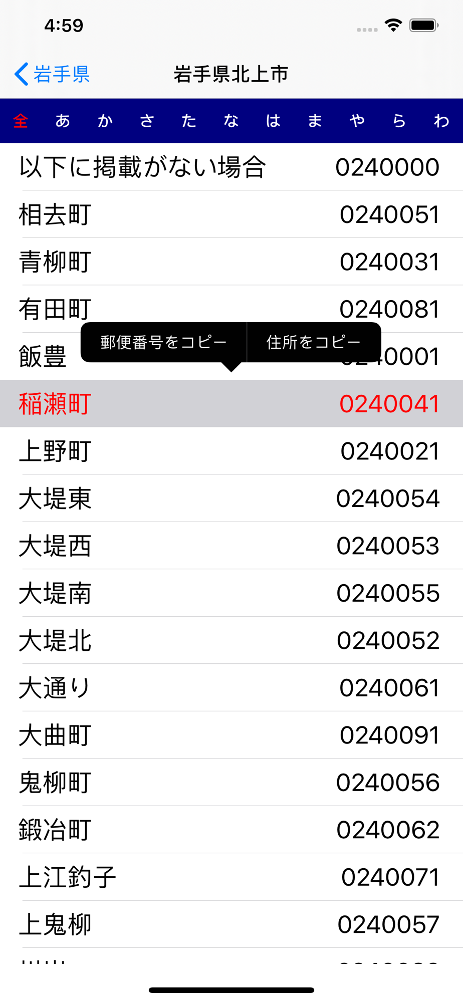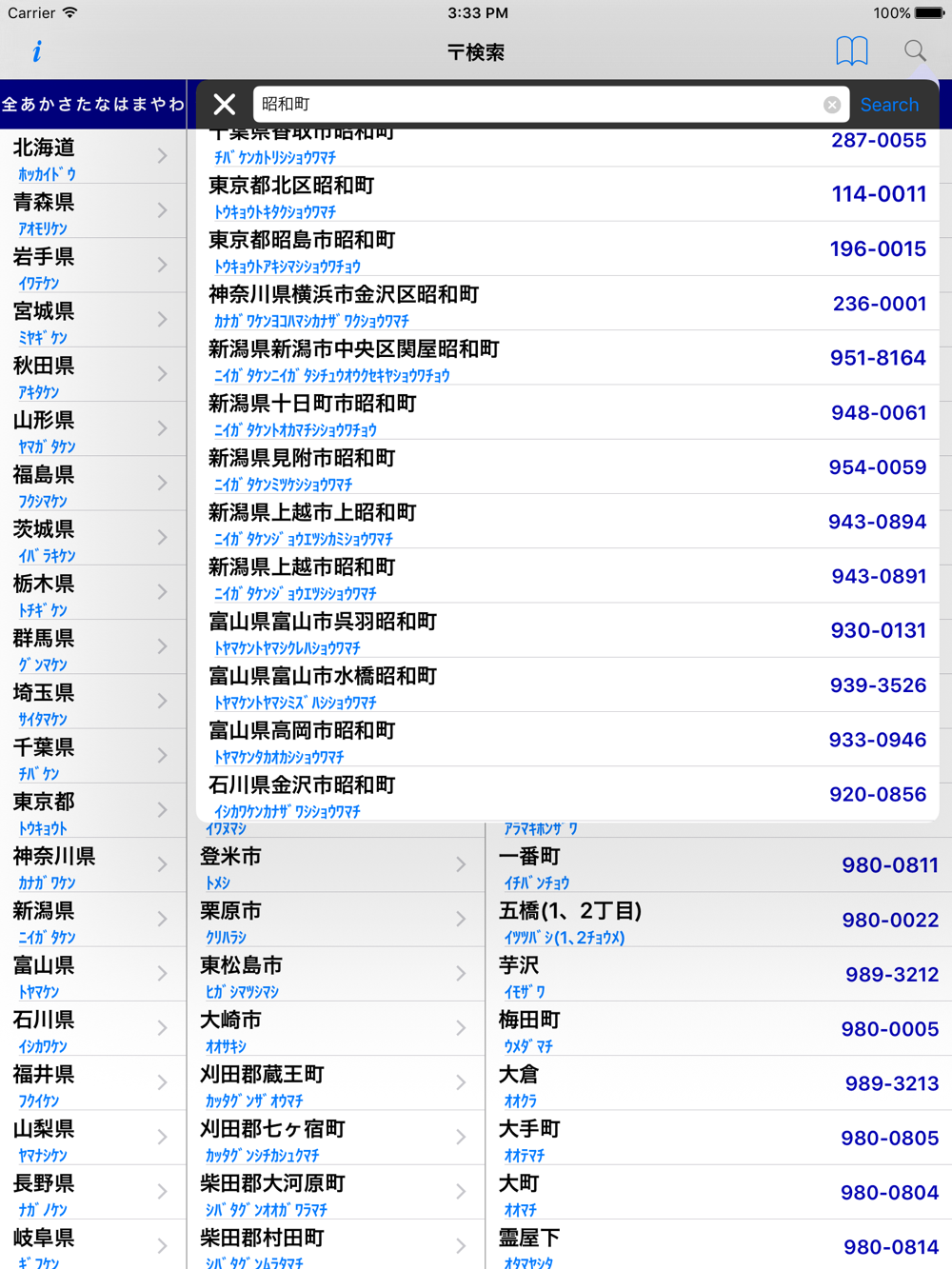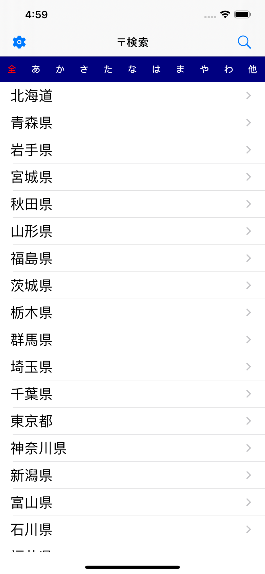 調べたい地域を一覧からタップするだけで、郵便番号を調べることができます。