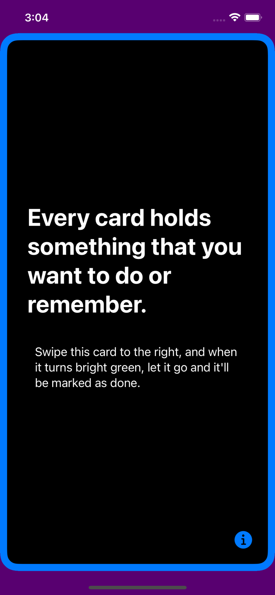Other task managers fill your screen with llists, and require you to set time tables and dependencies. Back Burner follows the model of a card deck, allowing you to have one idea per card, and just rotate through, swiping left to postpone something you're not ready to do, or swiping right when you've done it.