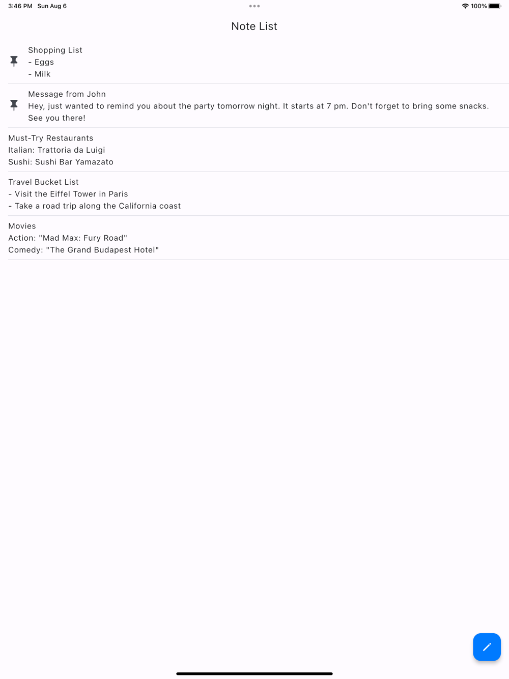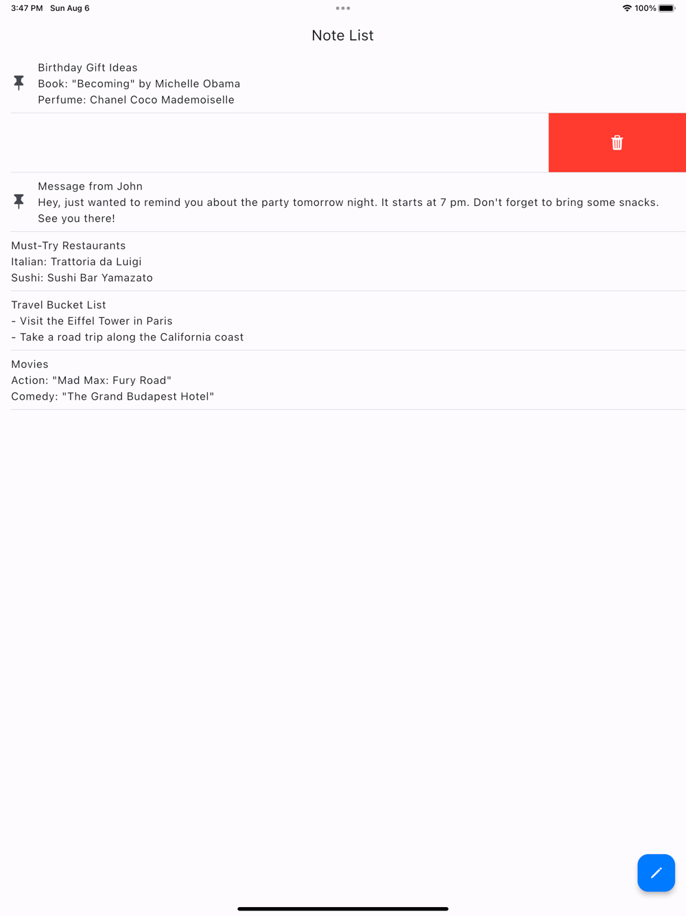 1. On the "Note List" screen, swipe to the right on the note you want to pin.