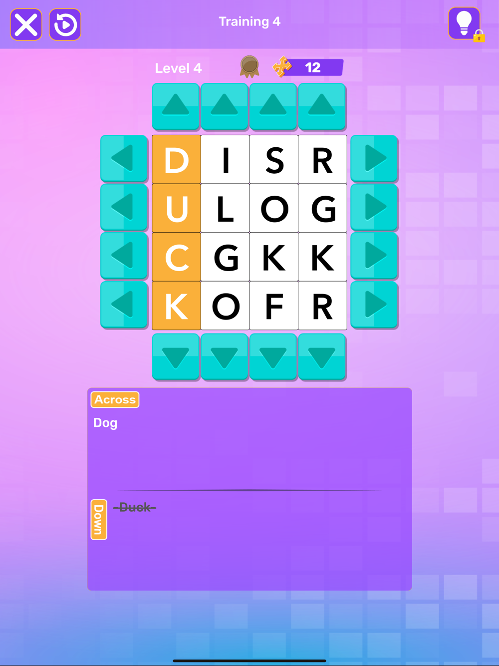 Beneath the grid are the words you need to find. Words can be found across the grid (left -> right), and down the grid. The words have to be found in the direction indicated. Finding a word in the wrong direction doesn’t count. If you look at the screenshots Duck has to been found DOWN while dog has to be found ACROSS.