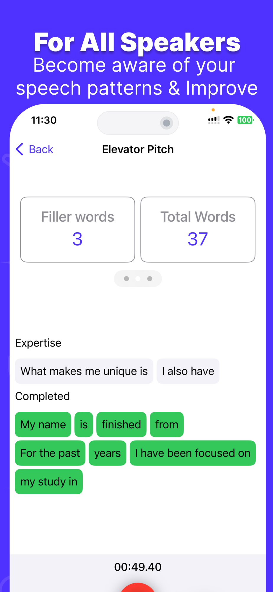 - View insights from your speaking (Filler words, duration, up talks, etc.)