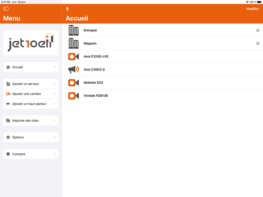 Visualiser depuis votre iPhone ou votre iPad les caméras de votre serveur d'enregistrement Jet1oeil. Il est également possible de configurer et utiliser des caméras de nombreuses marques différentes: Axis, DLink, IQeye, Mobotix, Sony, Vivotek