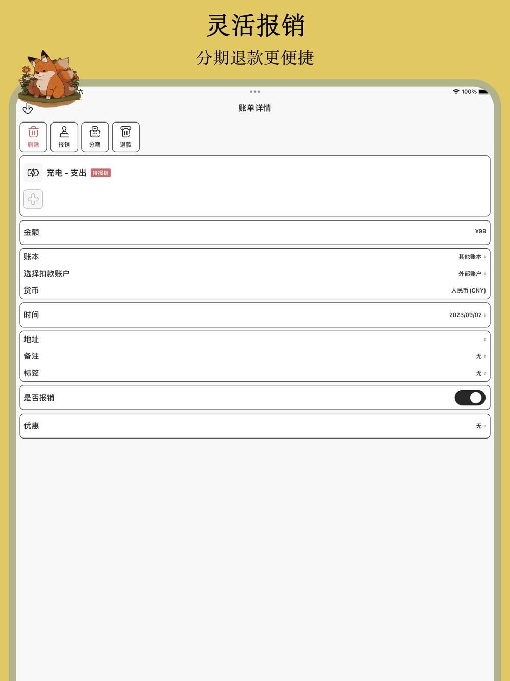 狐狸小账房是一款简单便捷、温馨可爱的生活记账应用。我们特别为您准备了一位憨憨可爱的小助手“小红”,她会用心地为您规划每一笔收入和支出,让您的生活财务一目了然。即便是那些看似微不足道、却日积月累的开销,也能在这里被清晰记录。
