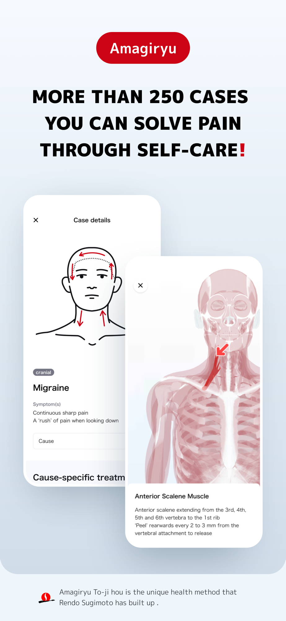 Introducing Amagiryu App, which provides a complete explanation of the causes, remedies, and detailed mechanics of physical problems. This health method app is useful for everyone, from medical professionals to beginners with no medical knowledge. With the belief of Amagiryu To-jihou that “your body is your own to protect!”, you can learn more about your own body and how to care for it through this app.