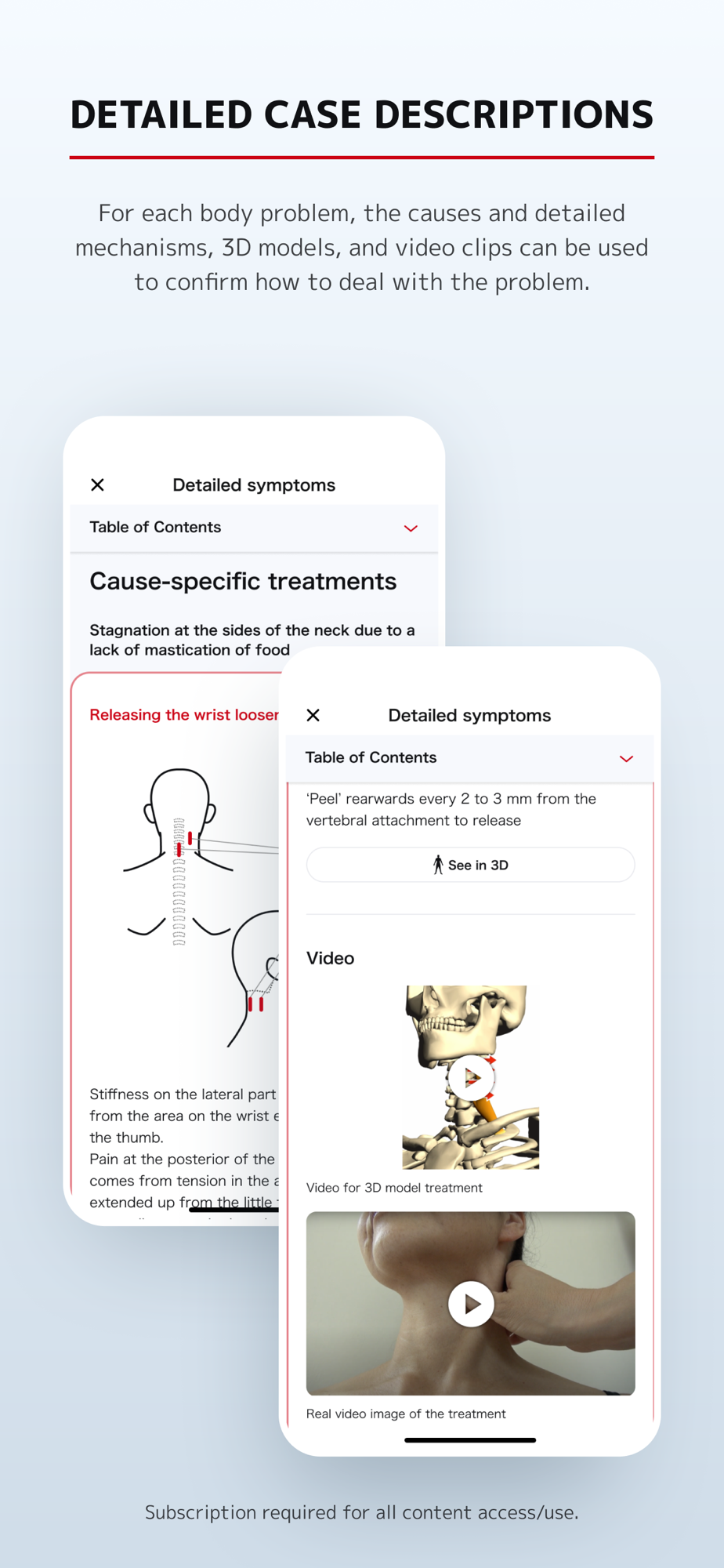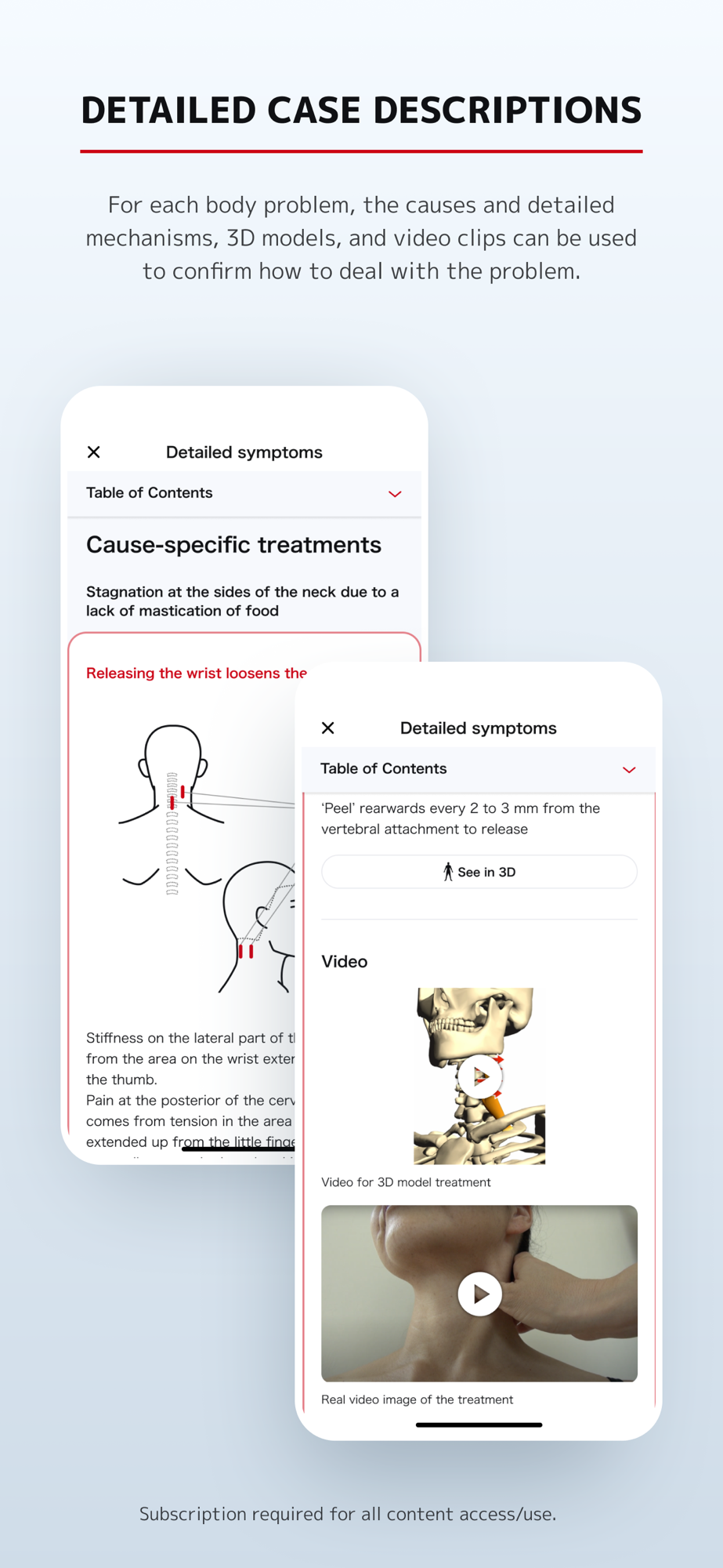 The app features detailed explanations of over 250 cases of Amagiryu To-jihou, and you can confirm the remedies not only by text and images, but also by 3D model and video.