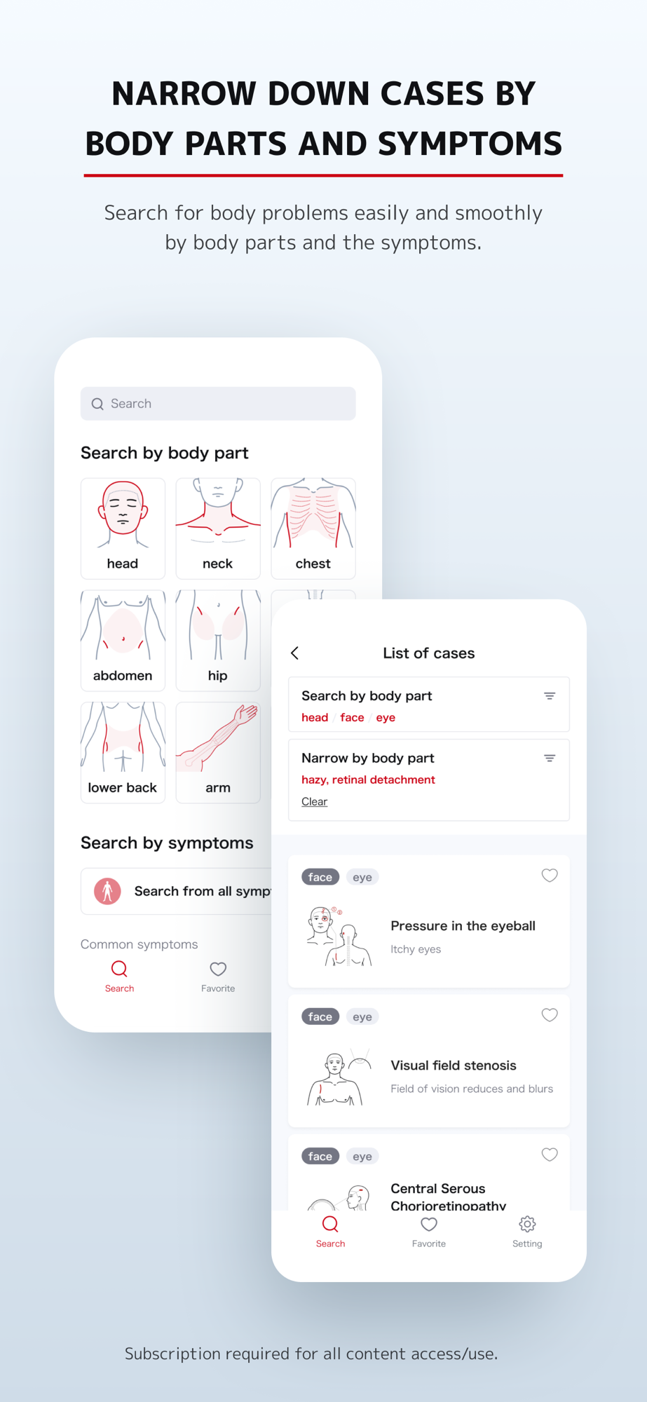 Not only can you search by part of the body such as head, arms, and legs, but you can also narrow down your search by symptoms. This helps to systematically find and resolve problems with your own body.