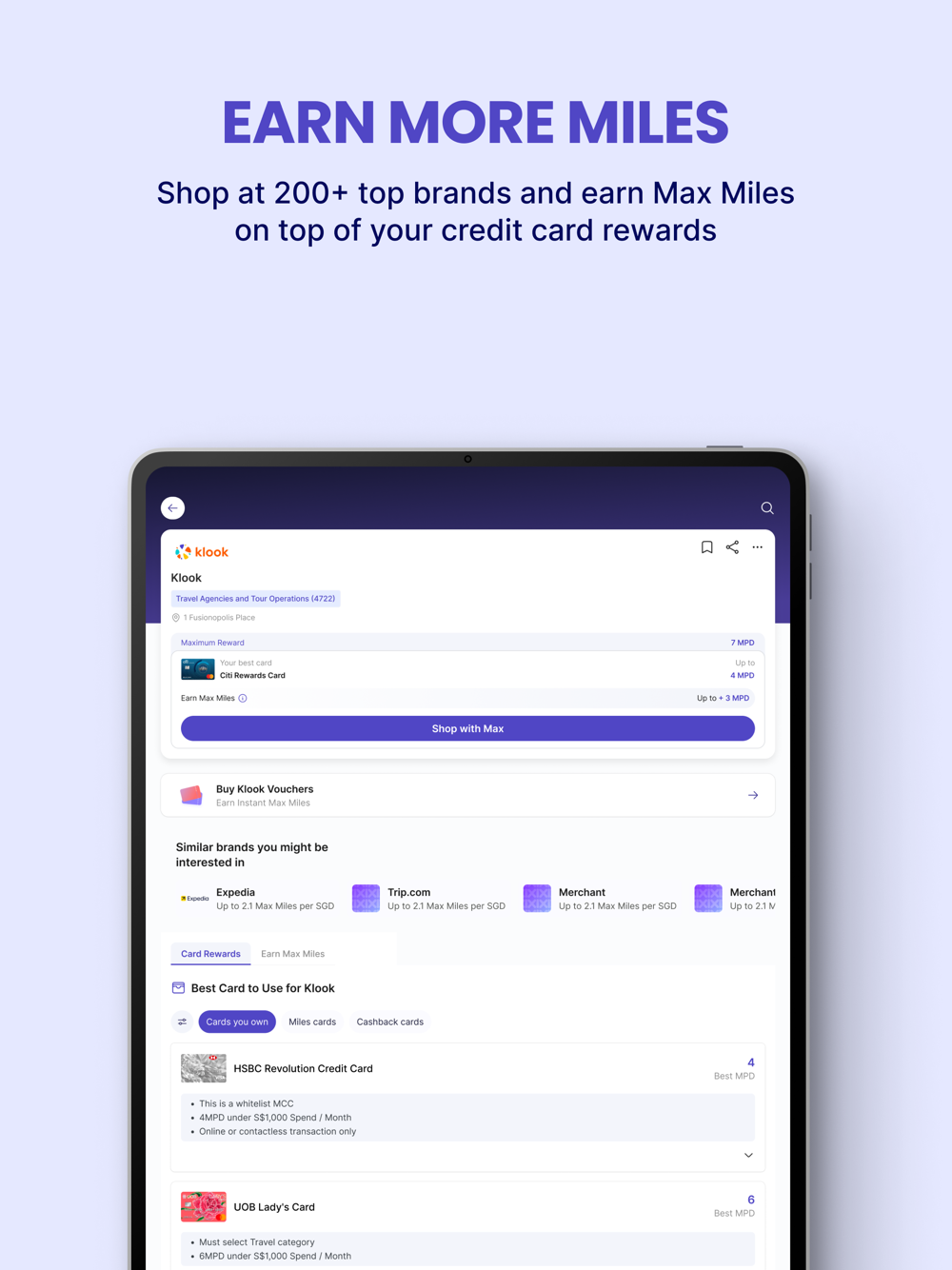 -> Shop with Max: Earn extra Max Miles on top of your credit card rewards when you Shop with Max at 150+ partner merchants, including popular brands like Shopee, Zalora, Lazada, Agoda, NTUC Fairprice, and more.