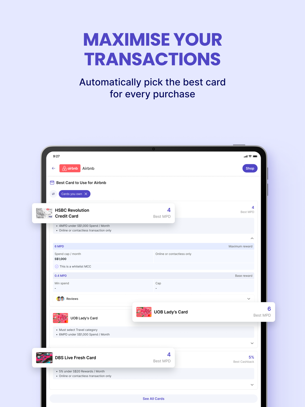 -> Choose the best card for any purchase: Search any merchant and heymax will automatically pick the best card to use for your purchase to maximise your rewards. No more remembering credit card terms and conditions.