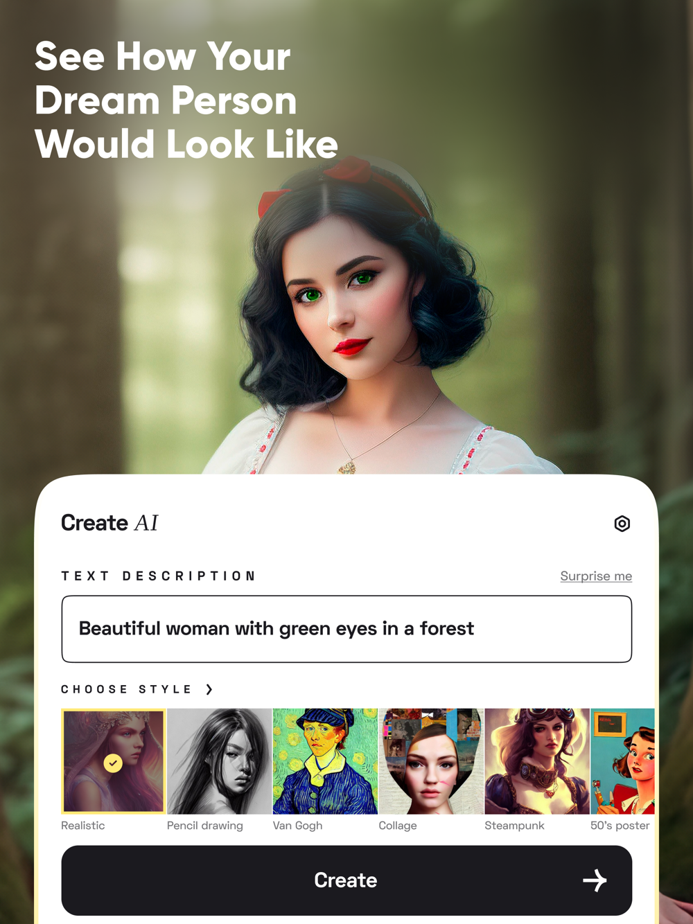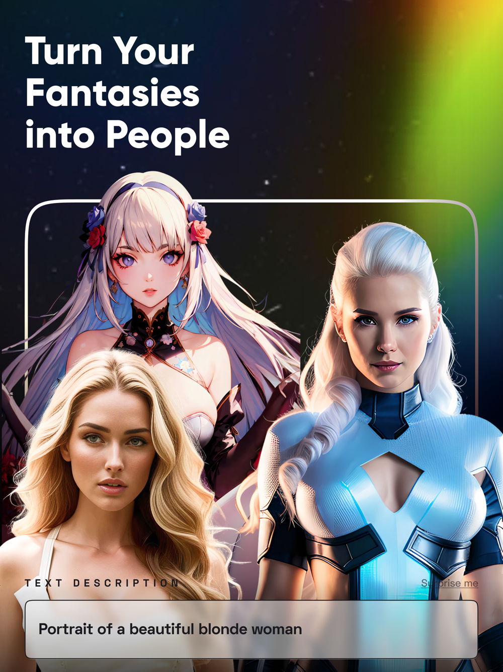 Choose gender, pick a style from hyper-realism to cyber-punk and fantasy, add details by specifying your prompt, and VOILA! – your dream person’s pic is ready!