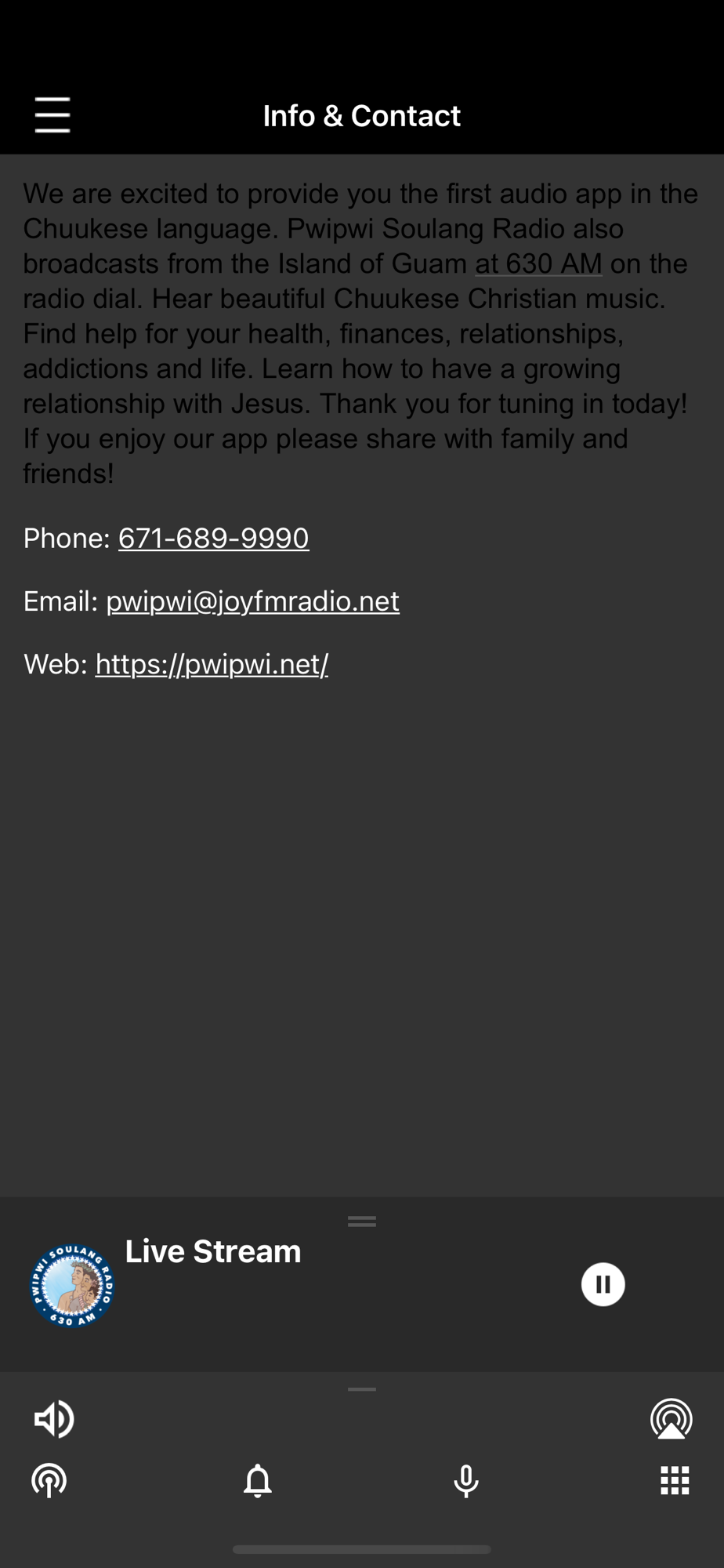 We are excited to provide you the first audio app in the Chuukese language. Pwipwi Soulang Radio also broadcasts from the Island of Guam at 630 AM on the radio dial. Hear beautiful Chuukese Christian music. Find help for your health, finances, relationships, addictions and life. Learn how to have a growing relationship with Jesus. Thank you for tuning in today! If you enjoy our app please share with family and friends!