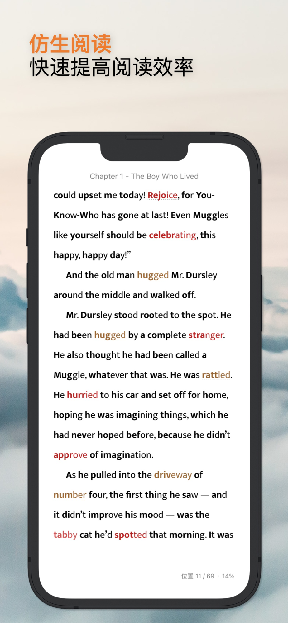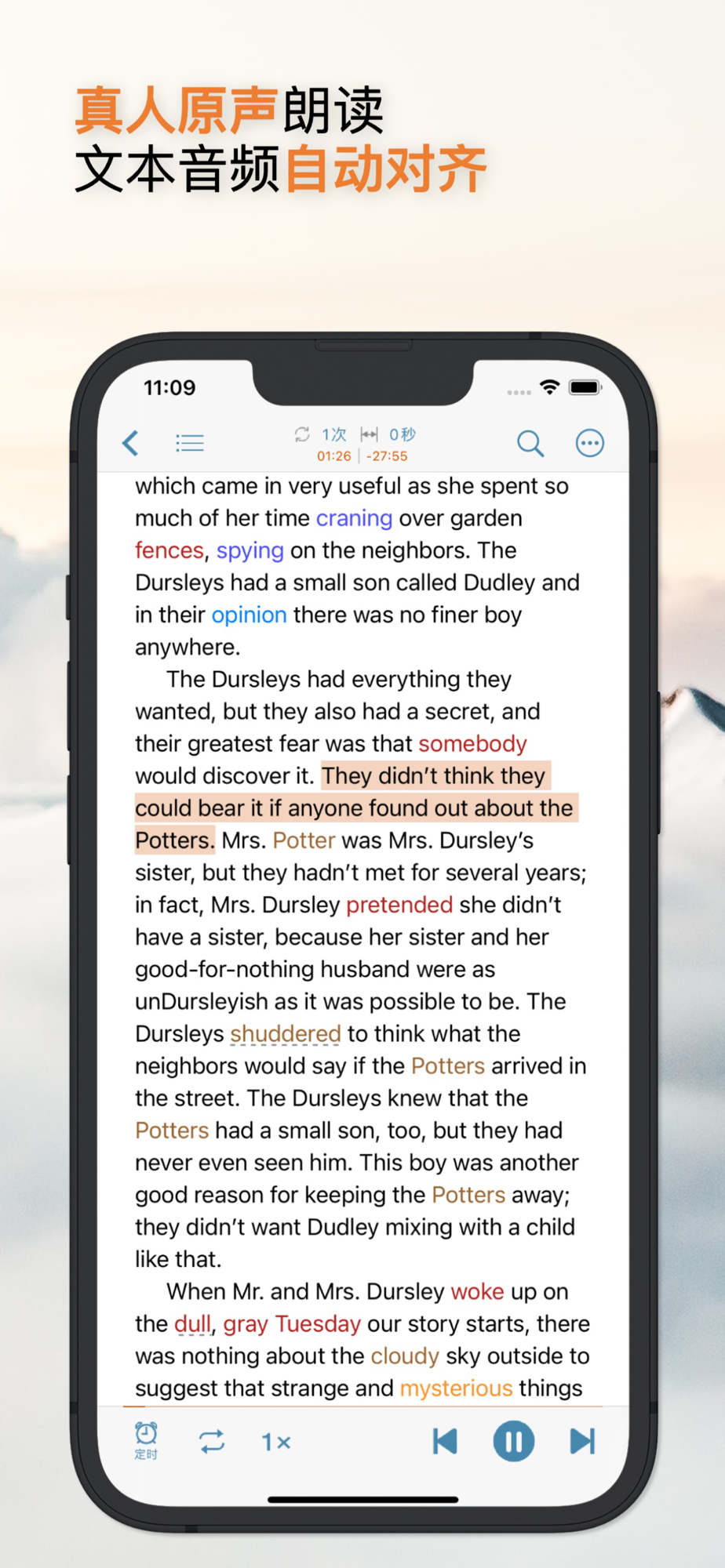 TYReader supports importing abridged books, pictures books, news and original books. Each book can contain an audio of a native English speaker reading the book. When playing the audio, the book will highlight the current sentence being read.