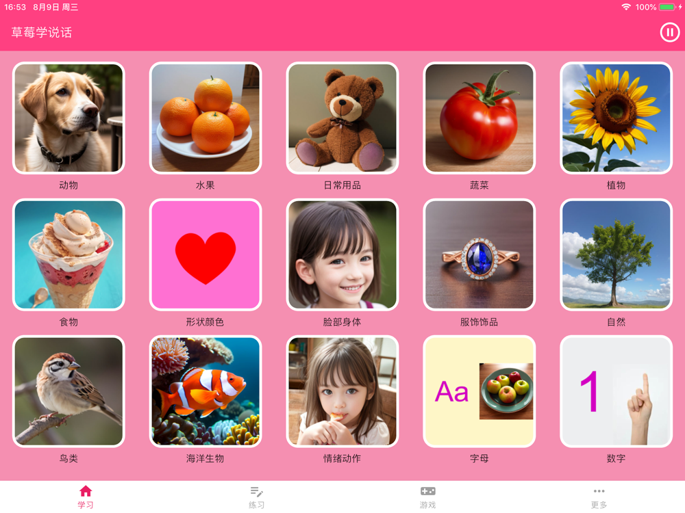 草莓学说话是一个针对0-5岁小孩设计的学说话应用,功能包括卡片学习、问答练习和有趣小游戏,使宝宝在快乐有趣环境下学习。