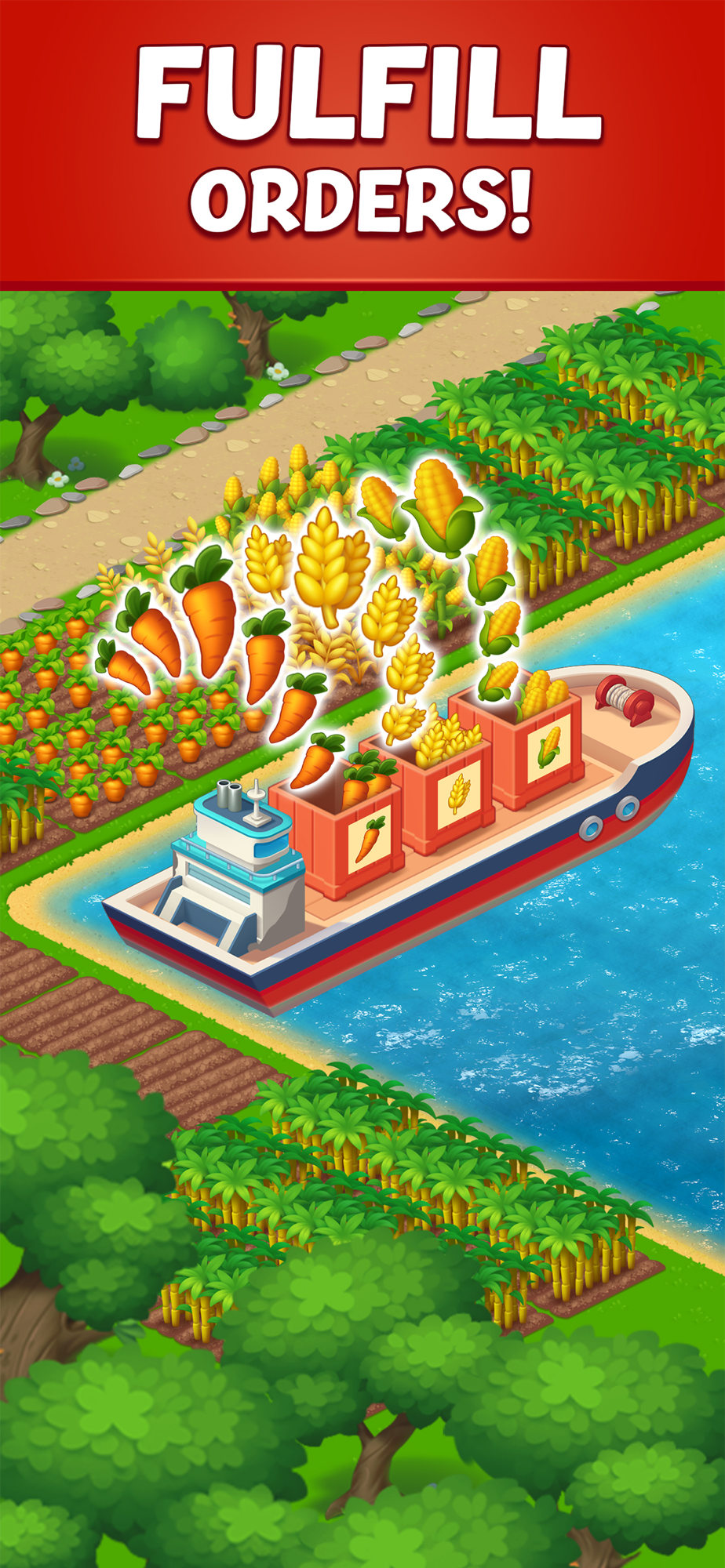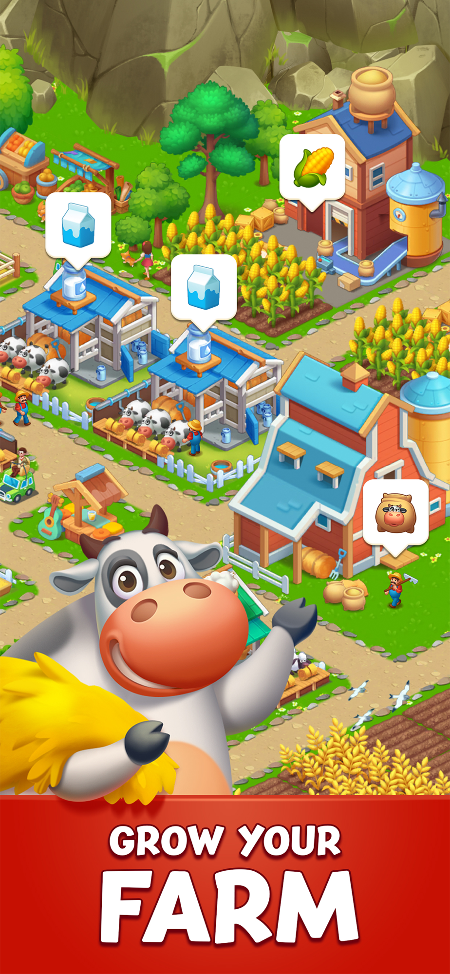 Come and relax in this free chill and idle farming game, grow your fields, milk the cow, do the daily harvest, take care of your animals in your animal farm, hire workers and build bigger barns. When harvest season comes, sell your products to the merchants in town and become the greatest farming tycoon on earth, the moon, and beyond with your golden farm.