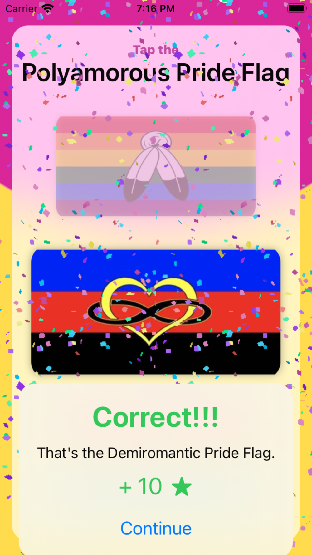 The LGBTQ+ Flags Quiz App offers an interactive and engaging gameplay experience that will test and expand your knowledge of LGBTQ+ flags. The mechanics are simple yet captivating: you'll be presented with a series of LGBTQ+ flags, each brimming with its own significance and story. Your mission? Tap the correct flag to score an exhilarating 10 points. Feel the rush of excitement with each accurate tap as you prove your expertise in identifying flags that symbolize various aspects of the LGBTQ+ community.
