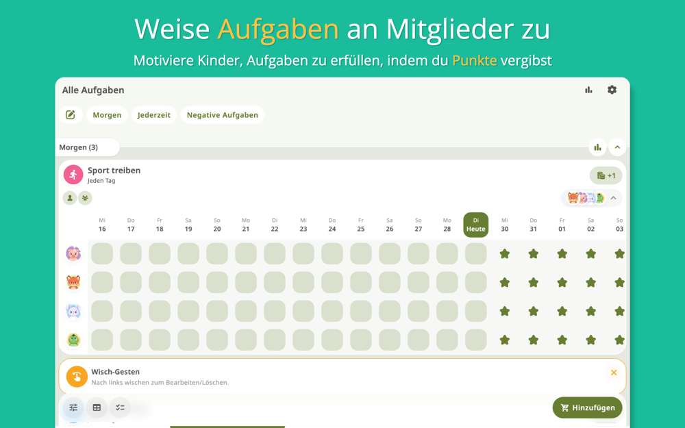 Erstellen Sie Aufgaben mit Wiederholungsplänen, weisen Sie Aufgaben und Punkte zu, bekämpfen Sie schlechte Gewohnheiten mit negativen Punkten.