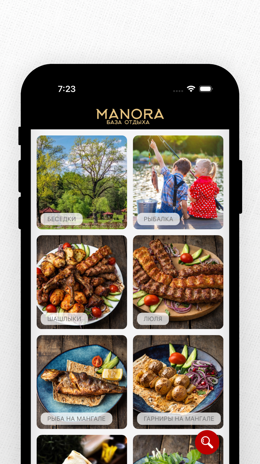 Мобильное приложение для заказы еды на база семейного отдыха Манора, на живописном берегу Станиславских прудов. Манора - рыболовный клуб, ресторан, летние беседки, домики круглогодичные домики.