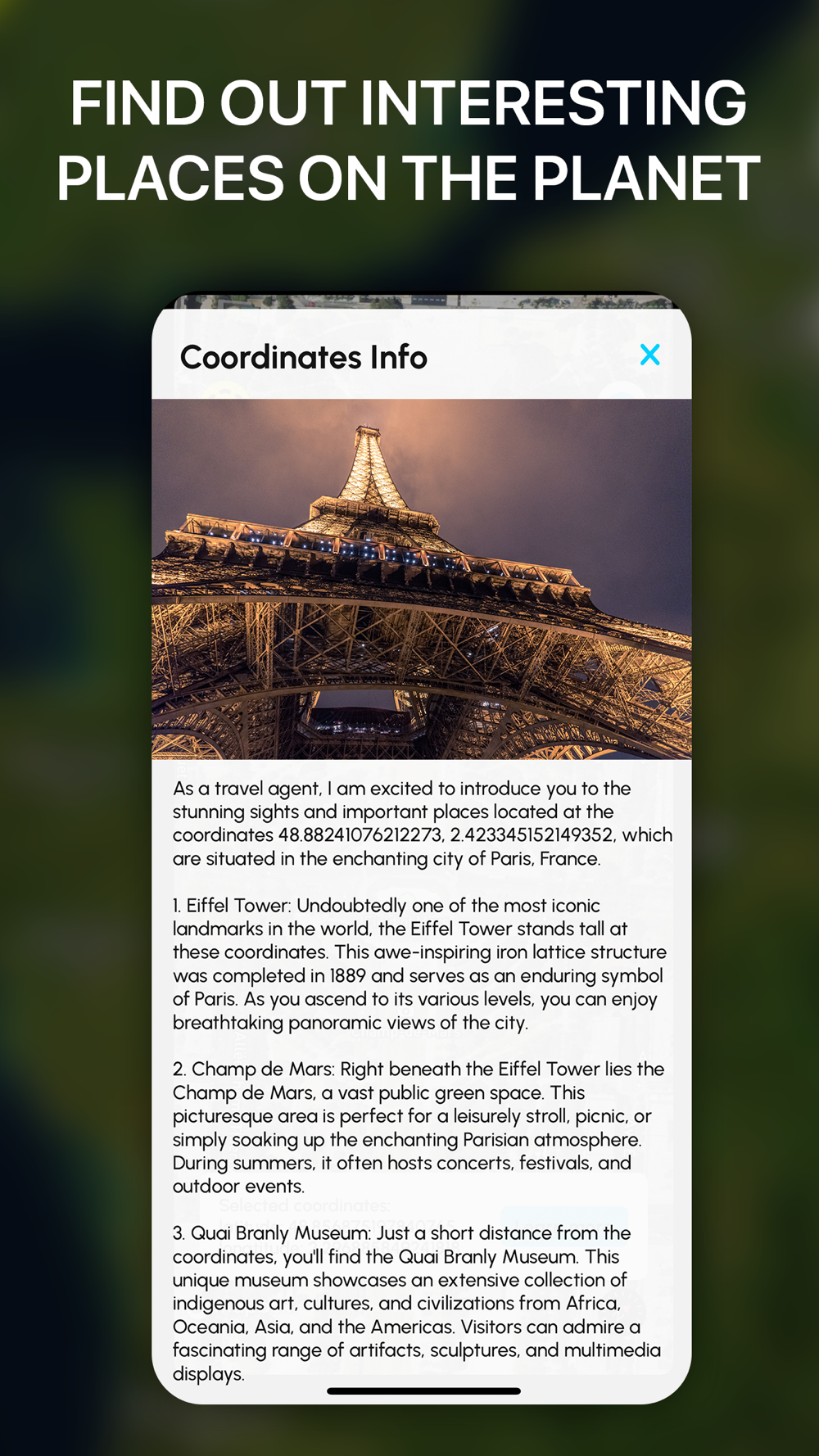 1. Point Description: When selecting any point on the map, users can get a detailed description of that point, including information about landmarks, geographical features, history and other interesting facts.
