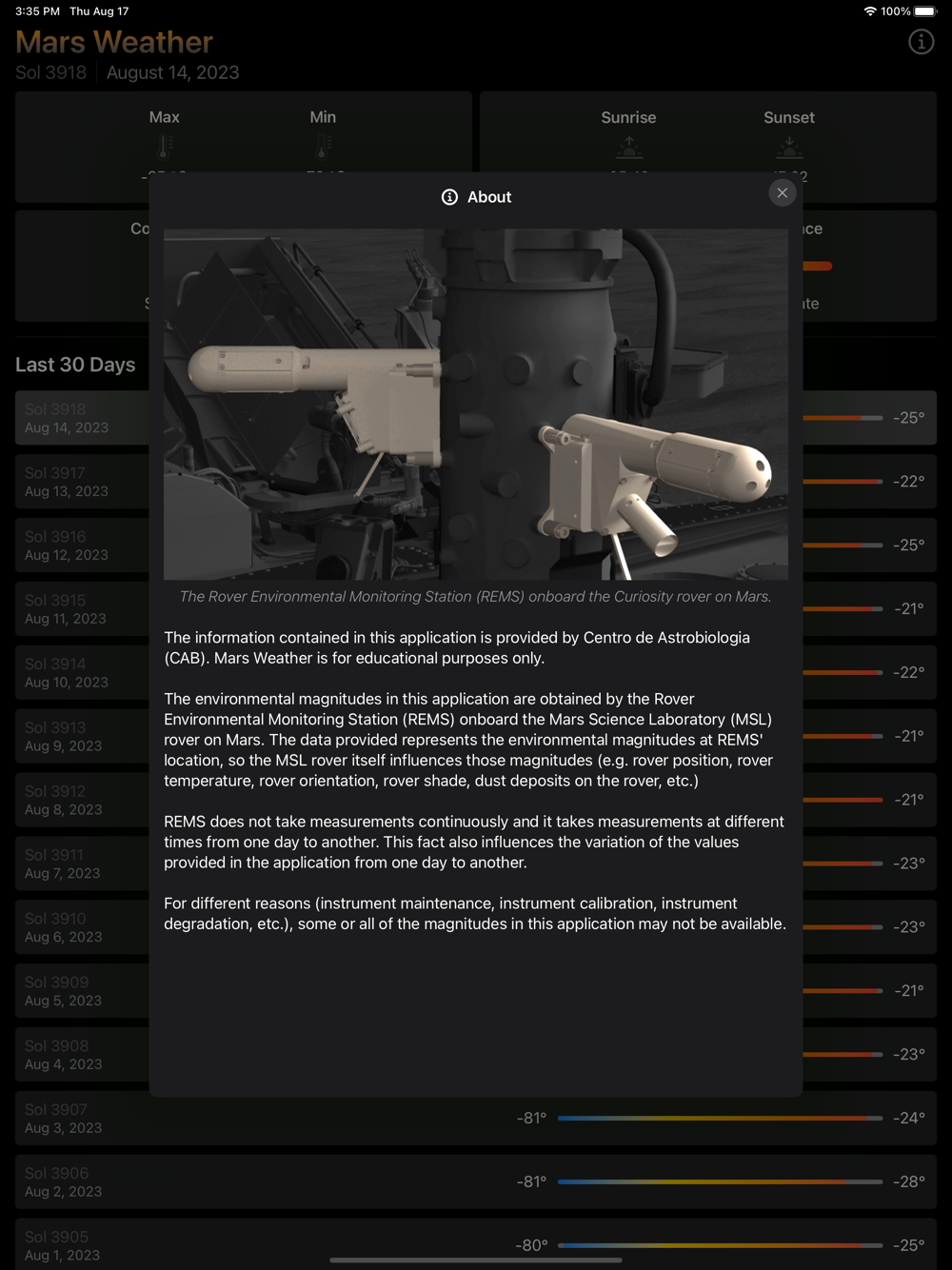 Explore and discover the Martian climate with Mars Weather, designed exclusively for the Apple App Store. Seamlessly harness data transmitted by the NASA Curiosity Rover Environmental Monitoring Station (REMS) to meticulously track and dissect weather phenomena on the enigmatic planet Mars. Review the latest weather reports, track trends through sleek data visualizations, and explore the contrasts between Earth and Mars' weather patterns.