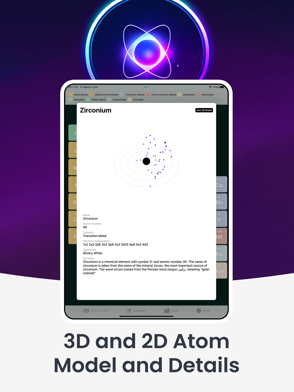 Dynamic Periodic Table: Say goodbye to traditional periodic tables. Tap on any element to unlock its secrets, from electron configuration to its appearance. Dive deeper with visual 2D and 3D models that illustrate the atomic structure, offering an enriched perspective of each element.