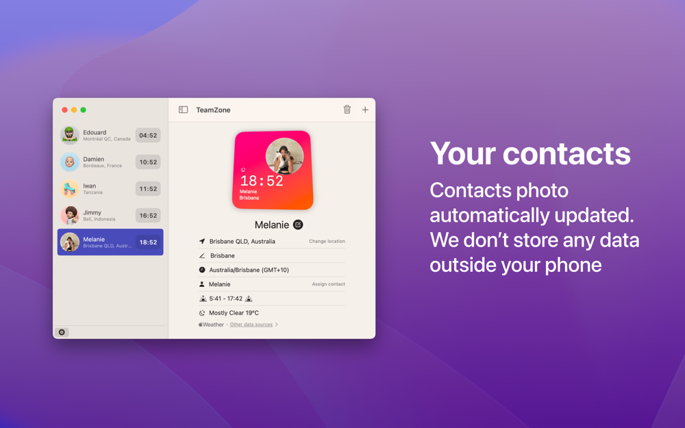 Whether you're a globetrotter, part of a remote company or simply want to keep in touch with loved ones around the world, TeamZone is the ultimate timezone companion.