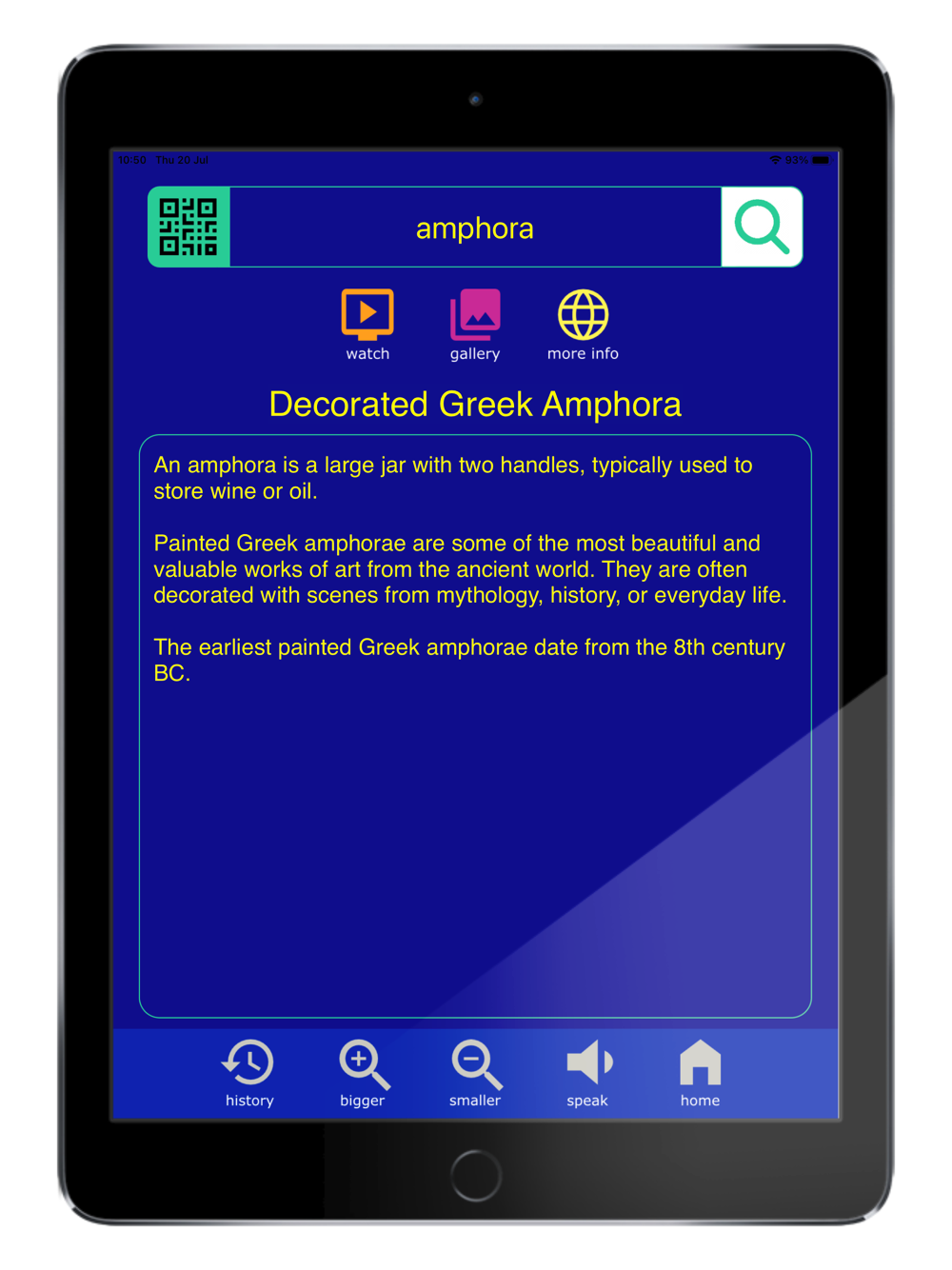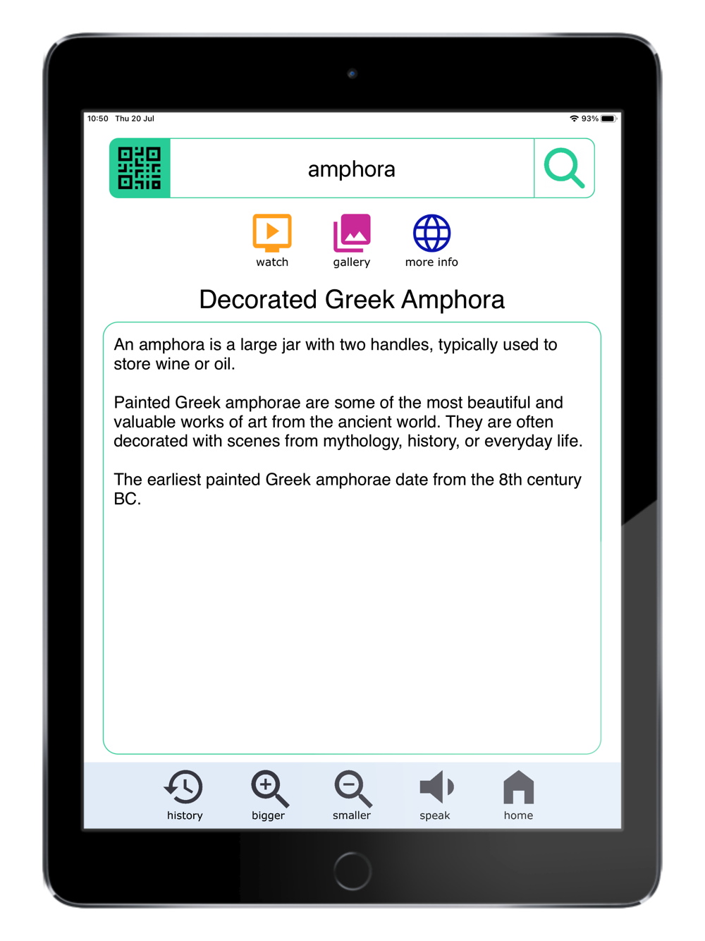 Use your iPhone or iPad to tap in or scan the code of the exhibit that interests you, into the Curio app. The display information is immediately presented on your screen. Exhibit information may include a gallery of captioned images, videos, audio clips and even interactive 3D models.