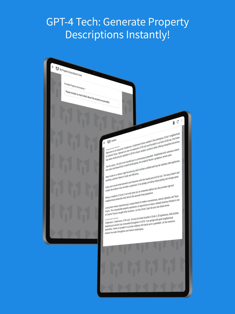 GPT-4 Powered Property Descriptions: Never struggle with crafting property descriptions again. Our Property Description Generator, backed by advanced GPT-4 technology, offers compelling, accurate descriptions, tailored for any listing.