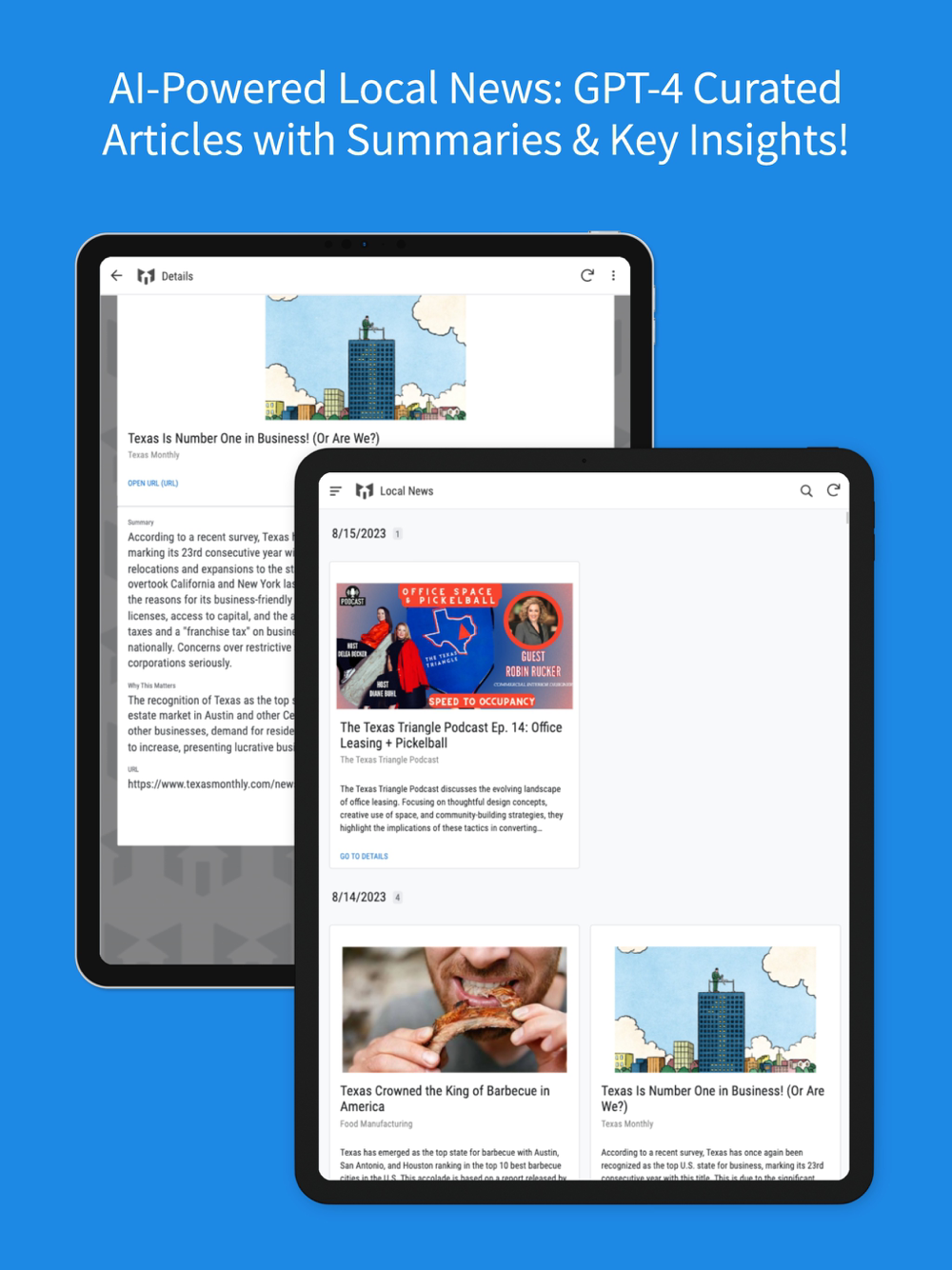 Curated Local News: Stay updated with the latest real estate news from around Austin. Our AI, leveraging GPT-4 technology, filters and curates relevant news articles. Summaries and key takeaways ensure you get the essence without sifting through long articles.