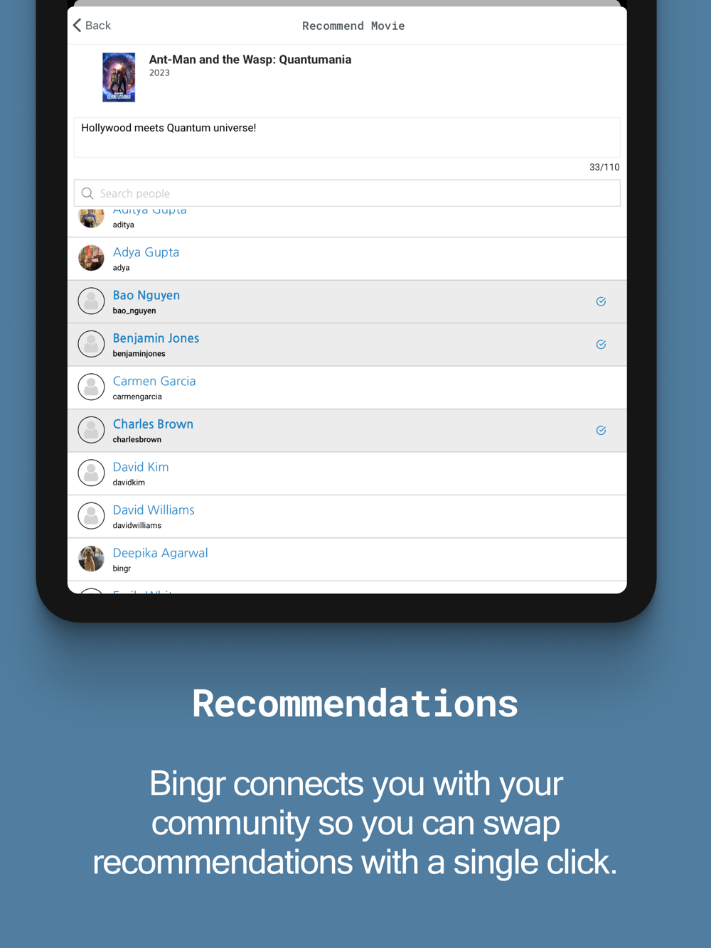 No more wasting time searching through streaming platforms, just get recommendations from the people you know and love! Bingr helps you find the perfect movie or show to watch by connecting you with your friends and family for personalized recommendations.