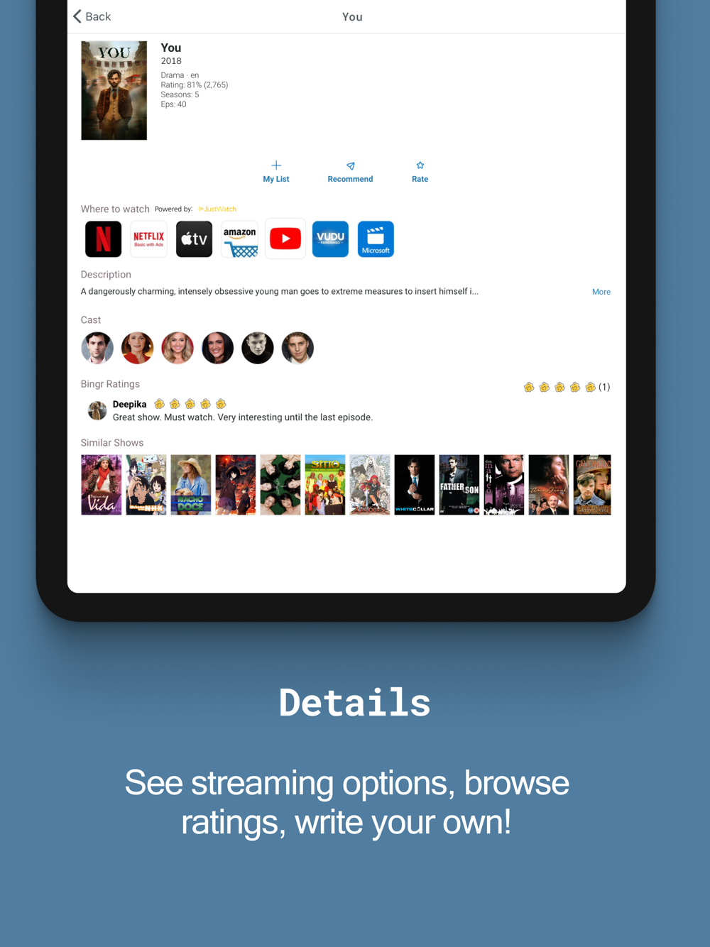 Bingr is the perfect way to find new movies and shows to watch, and to connect with other people who share your interests. With Bingr, you'll never have to be stuck for something to watch again.
