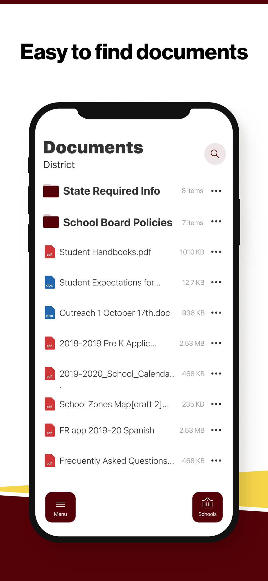 The event section shows a list of events throughout the district. Users can add an event to their calendar to share the event with friends and family with one tap.