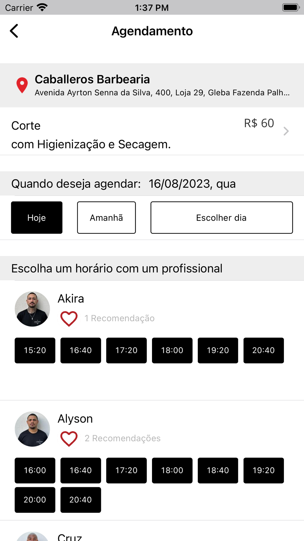 Na busca, você pode escolher seu profissional preferido, serviço, o melhor horário e a data de forma rápida e prática.