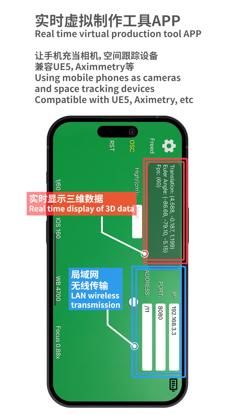 实时跟踪定位数据,通过无线局域网传送,支持FreeD,OSC协议,兼容Aximmetry;UE5等。