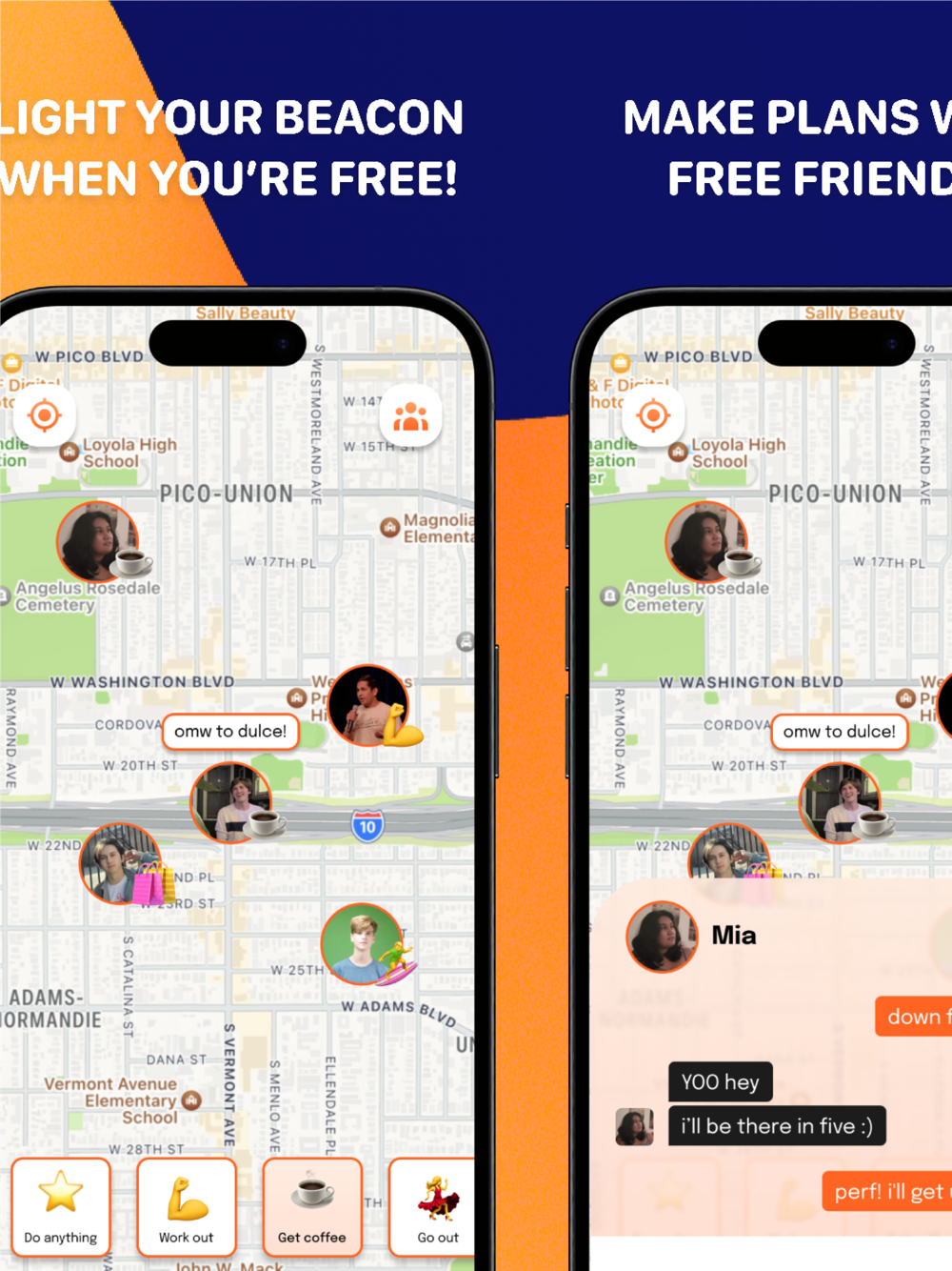 Just jump on the app, flip your location on, and see all your friends that want to hang out! Everyone's busy but with Beacon, you can pair yourself off with friends that have aligning schedules.