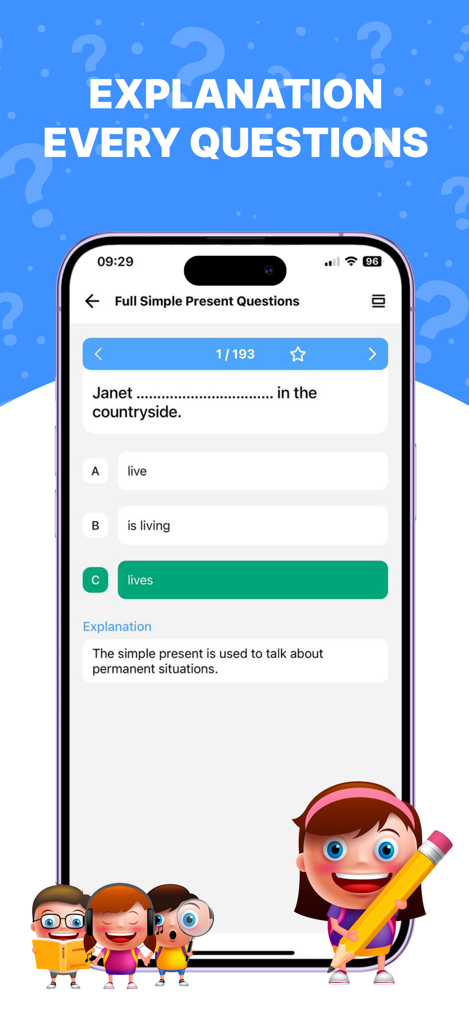 • Test mode with a time limit help you improve grammar skills and memorize questions in the easiest way