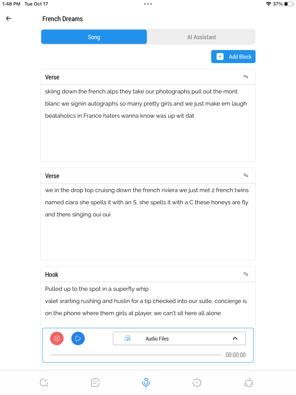 Create lyrics blocks, record your vocals, and unleash your creativity to write the next global hit. Find the perfect rhyme every time with our built-in rhyme dictionary. Utilize AI as an idea generator and lyrics writer for specific genres. Then, use your experience, talent, and creativity to add to and complete the song.