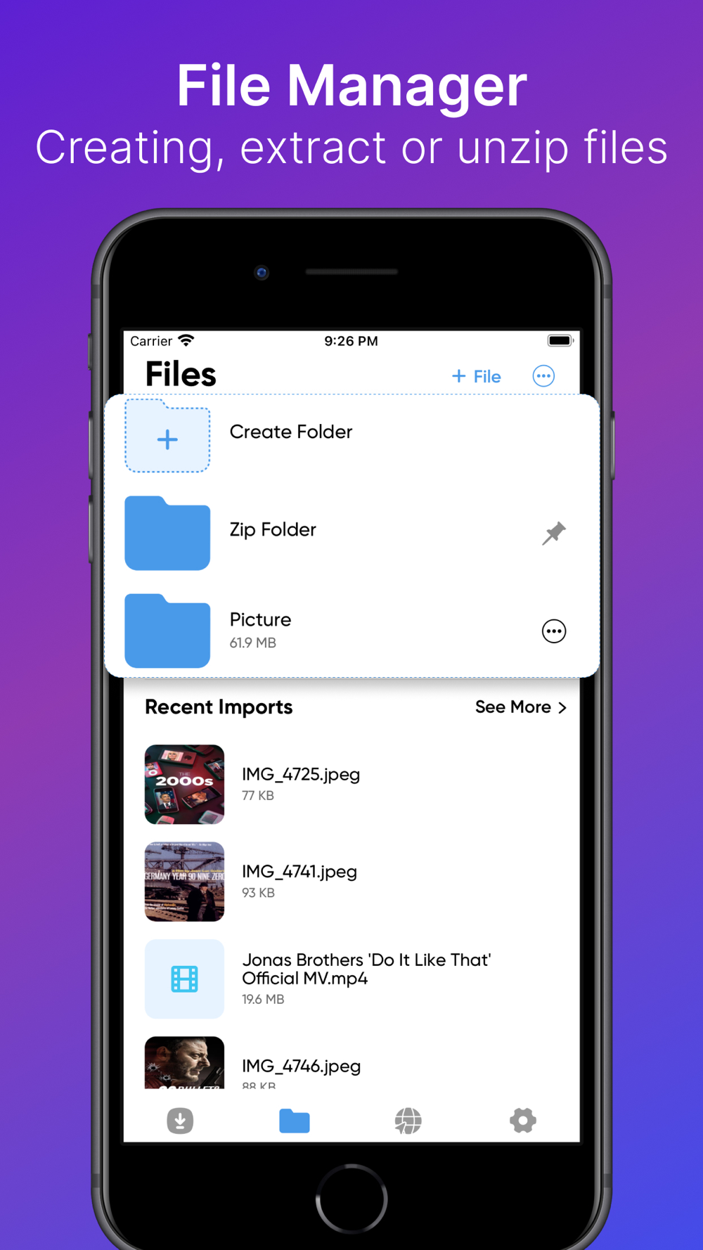 You can zip files and large on your device that you rarely use to save disk space on your device. You can unzip them again later when you need them.