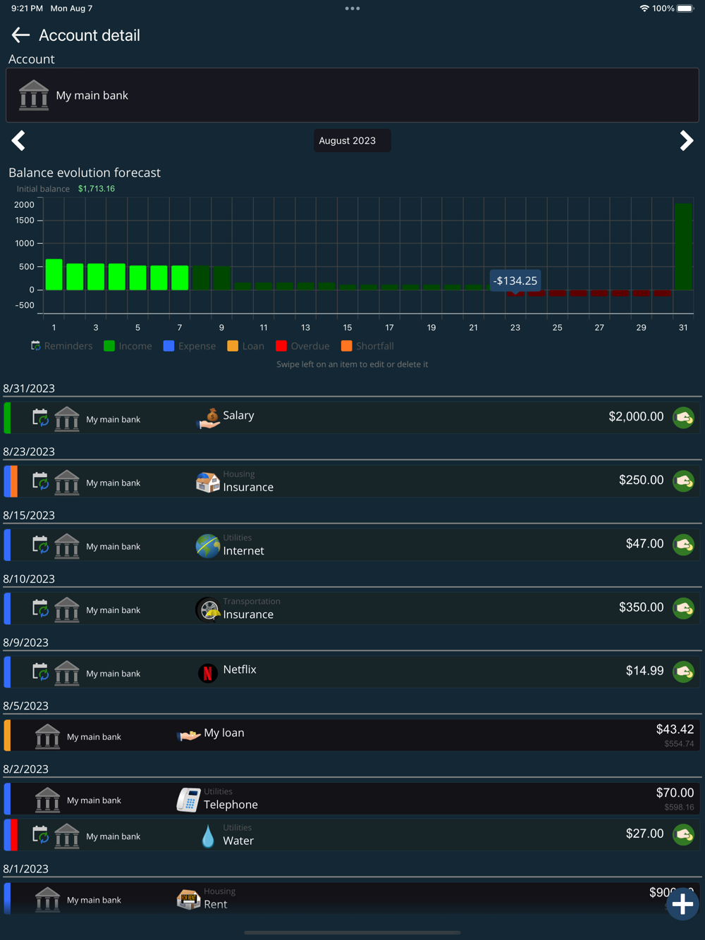 + Calculate the evolution of the balance of all your accounts based on current expenses, reminders, and defined budgets.