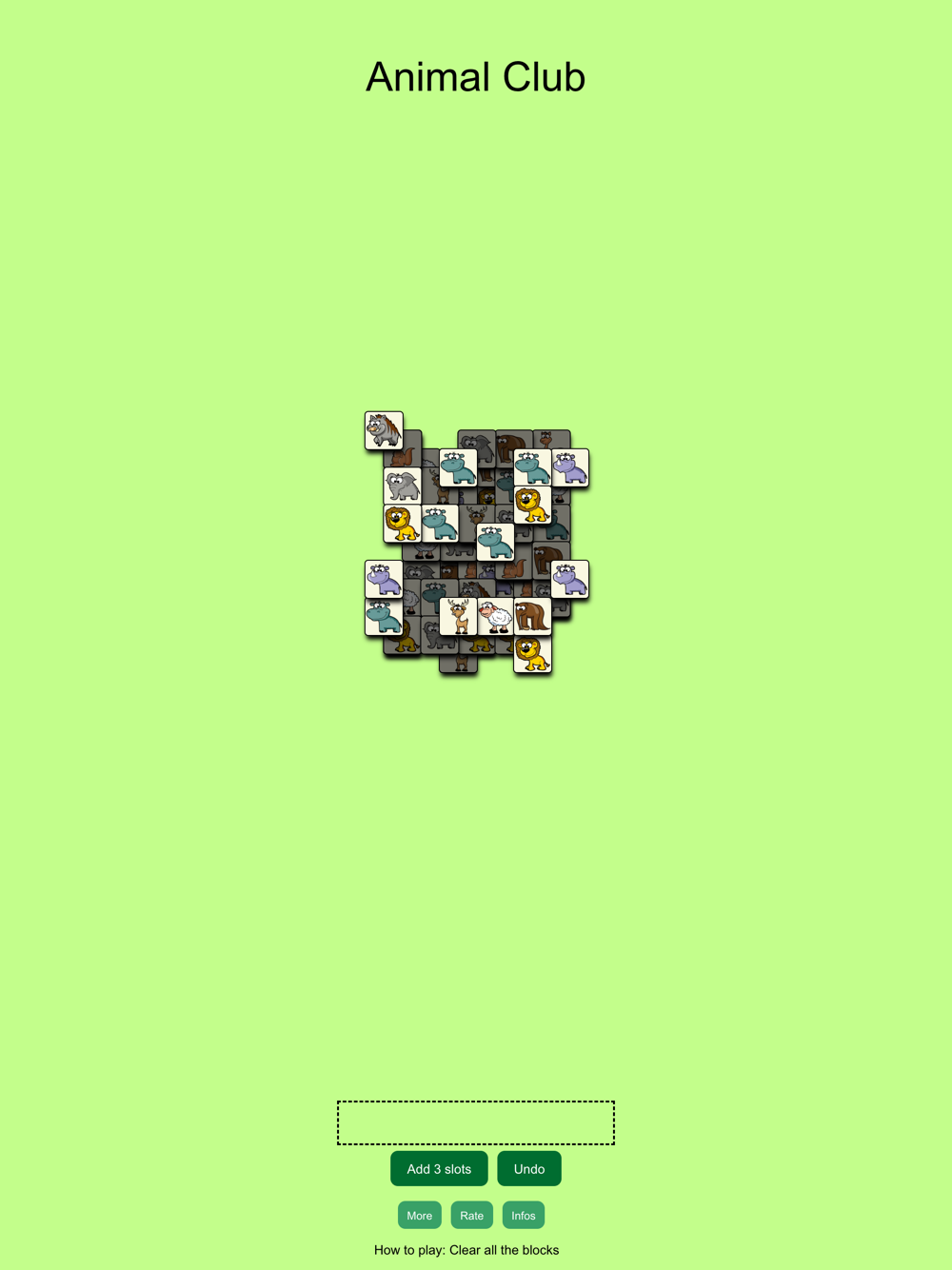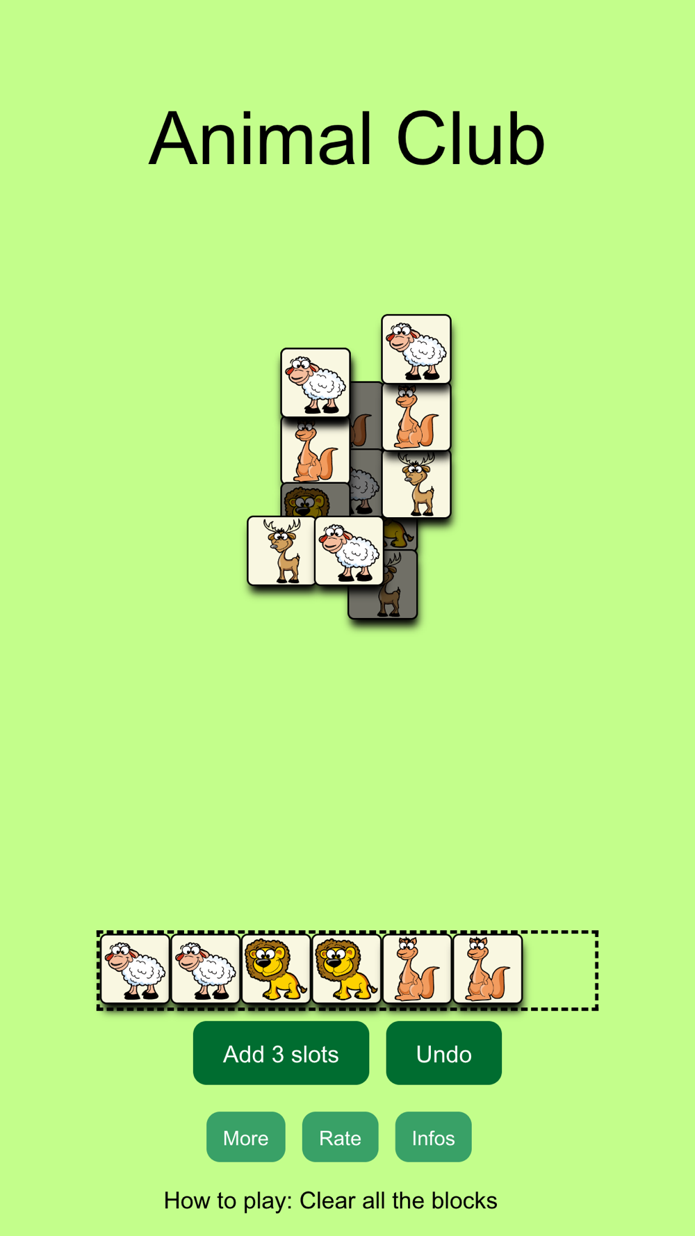 Very casual game, the gameplay is simple, in the game you need to clear all the cards, collect the same cards into the slots below, when the number of cards reaches 3, it is considered successful, until all the cards are cleared and enter the next level of challenge. It should be noted that the maximum number of slots to collect cards is 7, if it reaches 7 and cannot complete the card. Then the game is over. The cards in the game come in a variety of animal colors, making it a huge collection of zoos. Try how many challenges you can complete