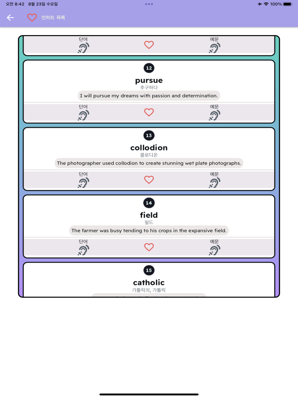 단어와 예문을 함꼐 활용해서, 어휘들을 확실히 익히시길 바랍니다. 단어 뜻을 공부한 다음, 문장의 뜻을 유추하는 연습을 같이 하세요.