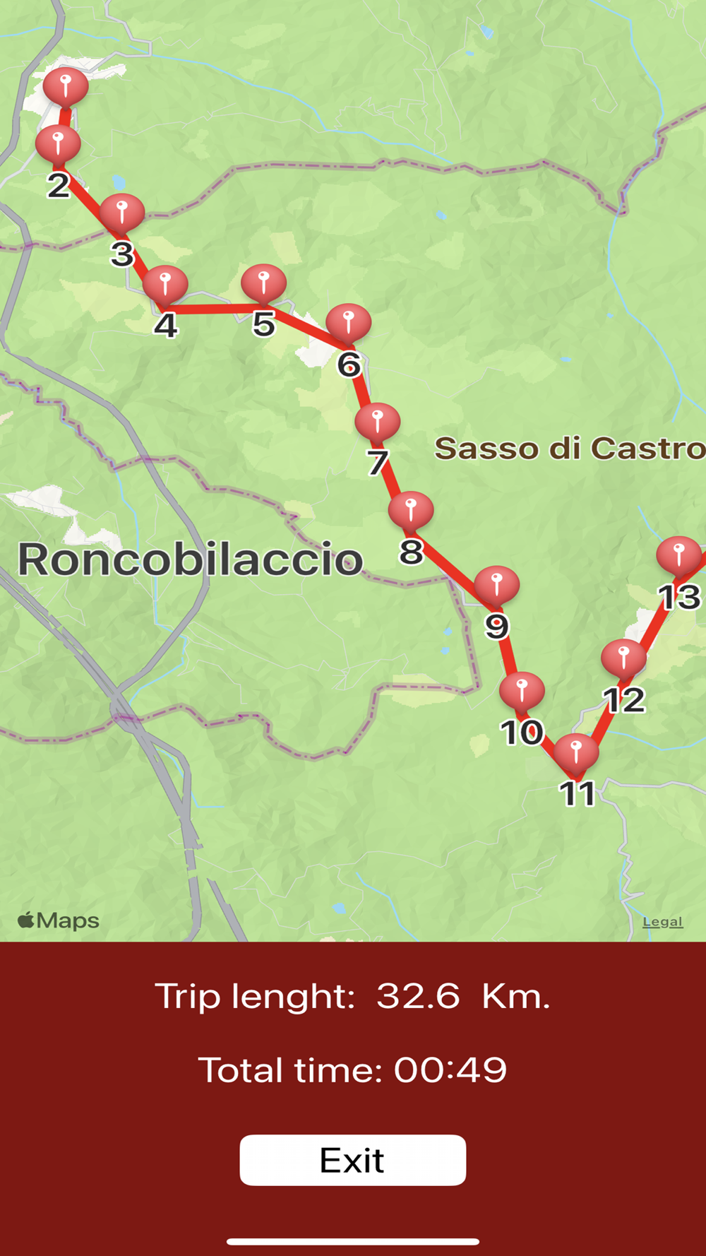 If you hit the Review button, and you have at least two steps recorded, the recording stops and a different view is shown, with all the recorded steps connected by red lines. The total trip length is anso shown.
