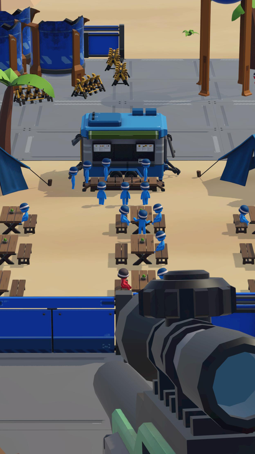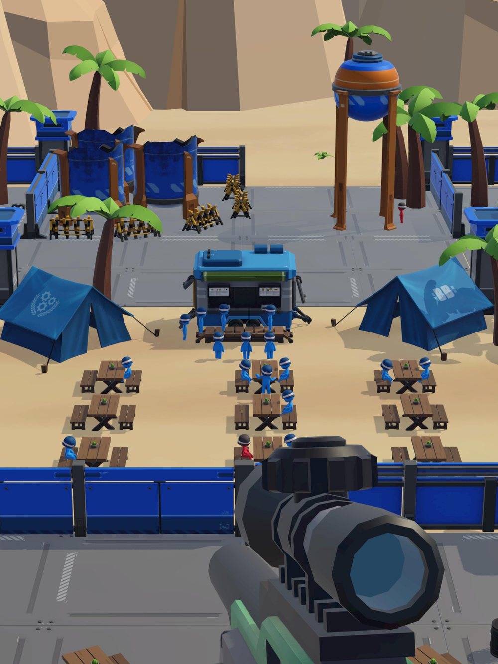 One war in the base of the battlefield, many enemy soldiers are hiding. As an elite sniper, you have spotted these red enemies. Your mission is to locate and eliminate them. They will be concealed in various locations, so you must search carefully to find them all and protect your comrades defending the base.