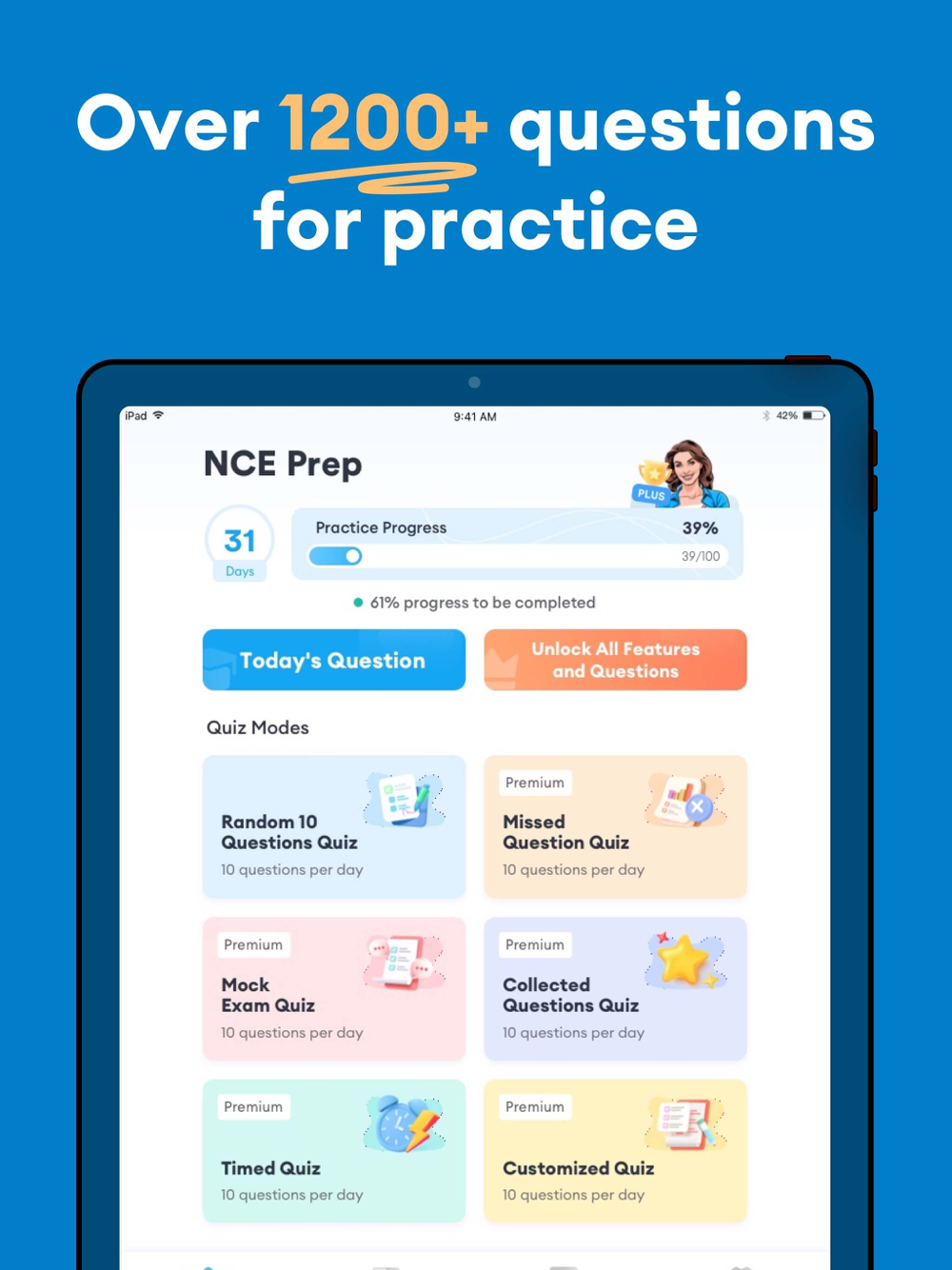 NCE Exam Prep for 2023 is an application carefully designed and developed by industry exam experts. With more than 1,200 high-quality questions and answers, multiple testing modes, and a scientific analysis system, it helps you practice anytime, anywhere, making it more likely that you will pass the NCE certification exam on the first try!